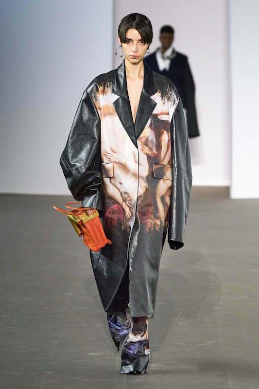 Для работы над осенне-зимней коллекцией креативный директор Acne Studios Йонни Йоханссон приглашает Роби Баррата — юного художника, который создает полотна с помощью искусственного интеллекта. Вместе они скормили нейросети живопись старых мастеров — и заставили машину придумывать орнаменты и фактуры для вещей актуальных силуэтов. Так получились кожаные плащи с размытыми фрагментами полотен Караваджо, костюмы с орнаментом, как на старинном жаккарде, и драпированные бархатные платья, которые компьютер создал, вероятно, на основе театральных занавесов.