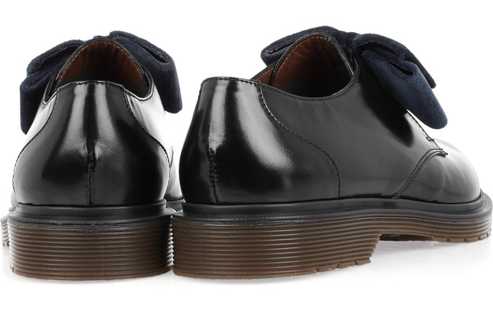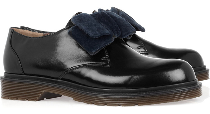 Грубые брогги из плотной блестящей кожи могли бы затеряться в огромном количестве ботинок на резиновой "тракторной" подошве а-ля Dr. Martens, если бы не одна умная деталь. Очаровательный бантик из темно-синего бархата венчает шнуровку, тем самым в корне меняя характер этих "вездеходов". Теперь это не очередные "мартенсы", а определенно ботинки Marni, в миловидных деталях которых за версту читается почерк Консуэло Костильоне и ее команды. Стоят брогги $480 и доступны на net-a-porter.com.