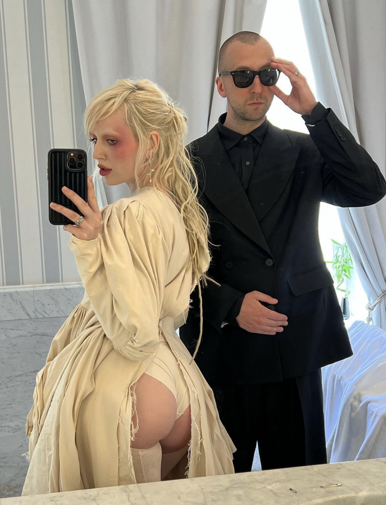 Свадебный сезон стилист Чураева с женихом Александром Васильевым открыли еще 13 мая. Да, наша подборка летняя, но пропустить этот образ не смогли. Восхищение, осуждение, вопросы «а где взять такое же?» — реакция аудитории на наряд Вики была бурной. Изначально платье Maison Margiela, в котором невеста провела вторую часть торжества, должно было стать «тем самым». Но потом все изменилось, ведь на глаза попалось «vampire dress» английского бренда Elena Dawson. Именно оно вдохновило на образ, отсылающий к эстетике любимой марки Виктории, Comme des Garçons.