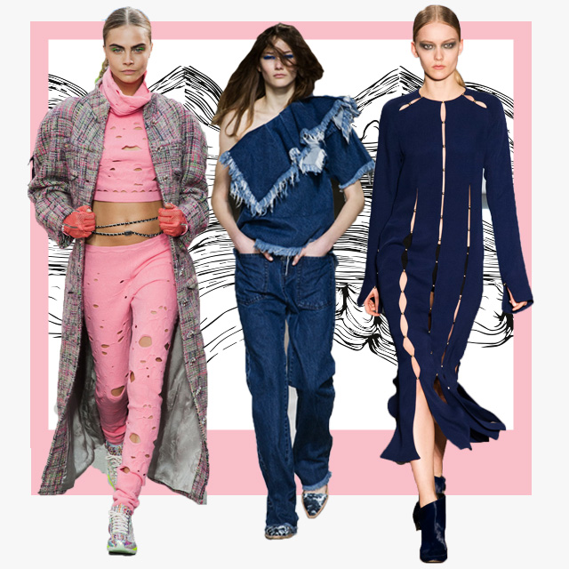 Не стоит ограничиваться одними только расслабленными пальто-халатами и вязаными костюмами, демонстрируя свою небрежность и легкое отношение к жизни. Добавим немного торчащих швов, пару потертостей или даже дырок на брюки и несколько рваных разрезов.
