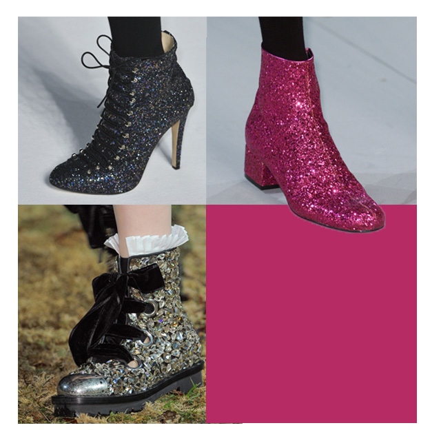 Своеобразным продолжением и "космической" футуристической тенденции, и увлечения сказками становится глиттер — переливающиеся пальто Rodarte и обувь с глиттером: туфельки "Мэри Джейн", сапожки и не только.