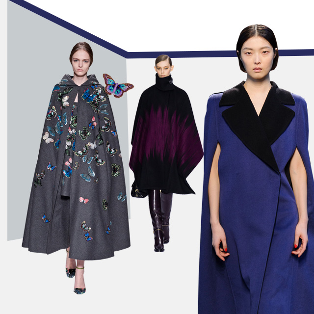 Кейпы для российской погоды — предмет довольно спорный, но, безусловно, красивый. Особенно хороши расшитые бабочками кейпы Valentino.