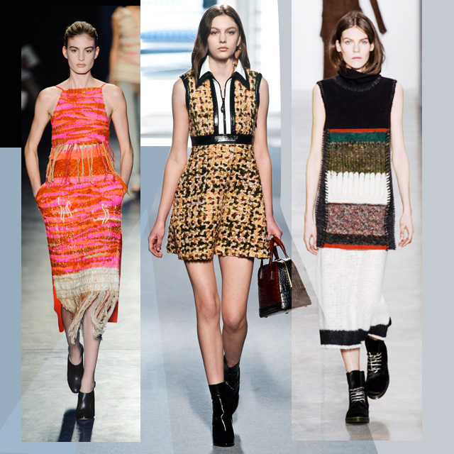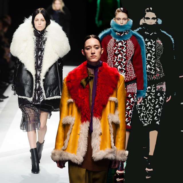 Простым color blocking никого уже не удивишь, поэтому дизайнеры эскпериментируют, соединяя в одном предмете самые разные текстуры. Особенно хороши эти пестрые шубы со вставками из цветного обычного меха, каракуля и ткани.