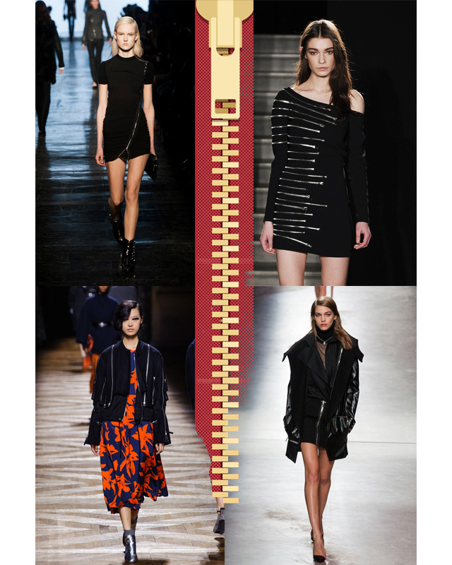 Накладные молнии, как накладные плечи, выглядят агрессивно, но по сути абсолютно бесполезны. Изрезанные металлическими "дорожками" жакеты и куртки, фейковые карманы, молнии, идущие крест-накрест, с задачей справляются, впечатление производят.