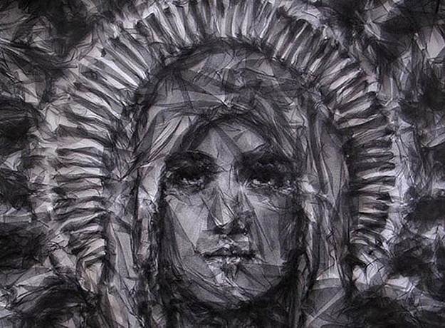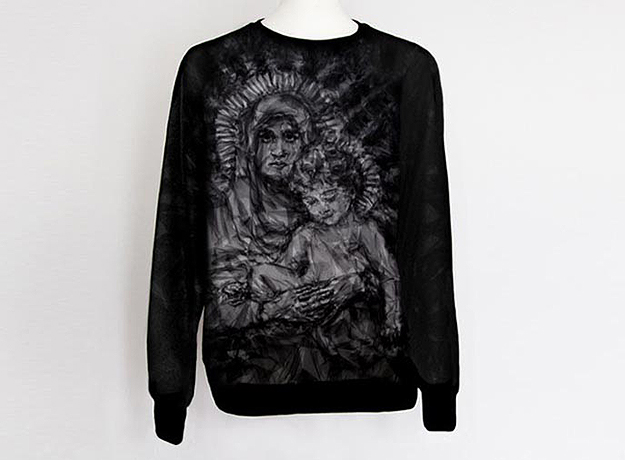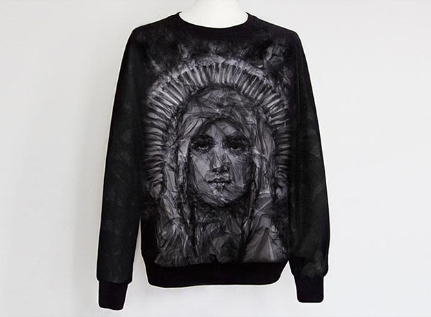 Модели стали живыми холстами для абстрактных женских лиц, выполненных из тюля и шифона. Эфемерные ткани создали эффект клубов дыма, которые вырисовывают собой узоры. Техника «рисования тюлем» принадлежит канадскому художнику Бенджамину Шайну, который непосредственно приложил руку к созданию коллекции. Шайн, выпускник Central Saint Martins, основал свою студию в 2003 году, где он начал проводить первые эксперименты на стыке индустриального дизайна и живописи при помощи тканевых и пластиковых текстур и техник. Он начал делать первые статичные портреты, вдохновением для которых были, кажется, все без исключения: от Энди Уорхола и Одри Хепберн до принца Монако и Маргарет Тэтчер. Помимо художественной ценности, портреты несли в себе еще и социальный подтекст: во многих работах художник использовал промышленные остатки ткани и даже пластика. В итоге необычный подход Шайна к ткани обеспечил еще довольно юному художнику всевозможные призы, участие в британских выставках и привлек к нему внимание модного дома Givenchy. Не так давно Рикардо Тиши привлек художника к созданию принтов в духе библейской иконографии. При помощи тюля художник и дизайнер воссоздали тканевые портреты Мадонны и младенца для лимитированной коллекции толстовок.