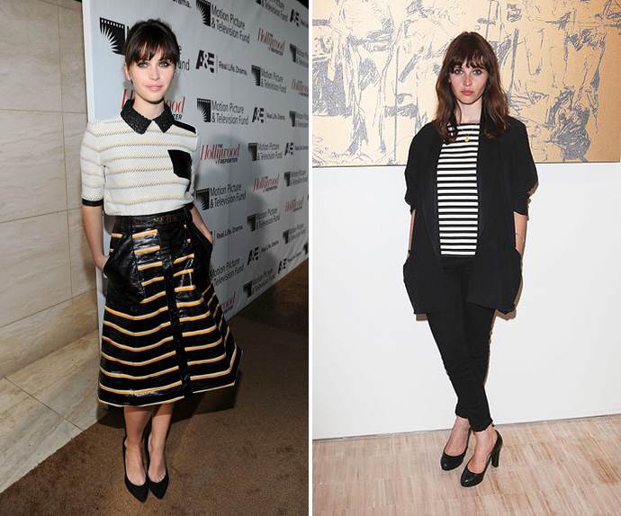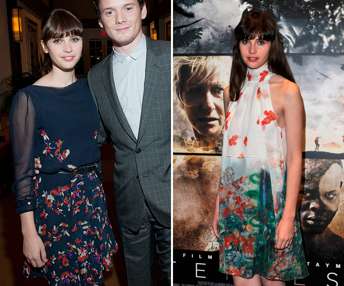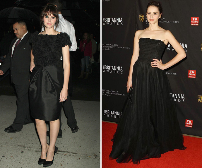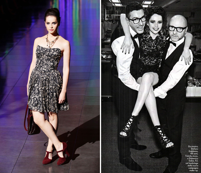 Фелисити недавно стала лицом косметической линии Dolce & Gabbana, первые кадры которой появились буквально на днях, но ее дружба с Доменико Дольче и Стефано Габбана не ограничивается одной лишь рекламой косметики. Актриса постоянно появляется в одежде бренда на мероприятиях (овощные платья особенно идут Фелисити) и даже принимала участие в показе.