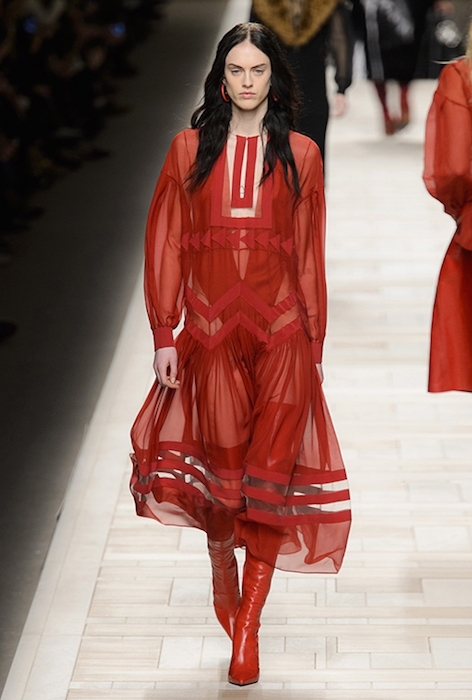 Другой стильный вариант — струящееся платье из невесомых тканей: органзы, сетки или шелка. Такие платья будут особенно красиво развеваться от первого весеннего ветра — лучшие примеры можно подсмотреть у Lanvin, Gabriela Hearst и Chloé показали слегка приталенные платье, а Fendi — ярко-алый наряд.