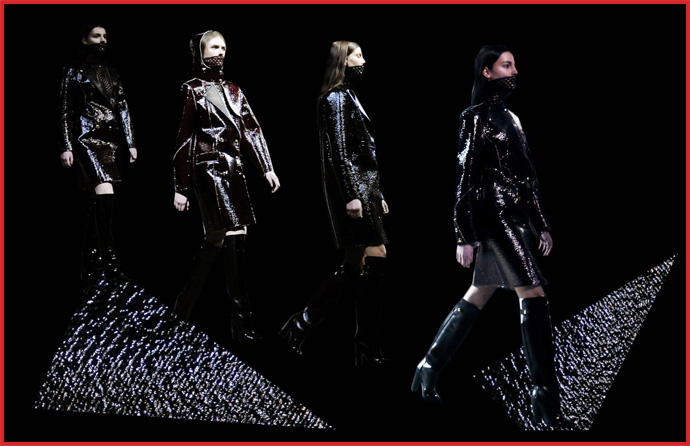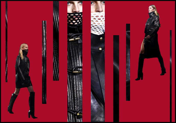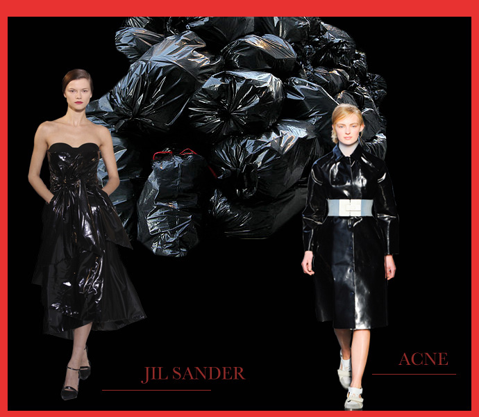 Для Александра Вонга, дизайнера одноименной марки Alexander Wang, черная кожа в первую очередь связана с технологичностью, прогрессом, а значит — и с движением в будущее. Для создания необходимого эффекта он использовал не только непосредственно саму кожу, но и нечто вроде ее аналога — лакированный твид. Вовсе техногенный внешний вид черная кожа приобрела в женских коллекциях Jil Sander и Acne, платья из которых созданы едва ли не для жертвы цивилизации — материал приобрел глянцевитый блеск, который делает кожу похожей на полиэтиленовые пакеты. Возможно, это не самое вдохновляющее сравнение, однако оно нагляднее всего показывает, как далеко могут зайти эксперименты с тканями и насколько успешными оказываются их результаты.