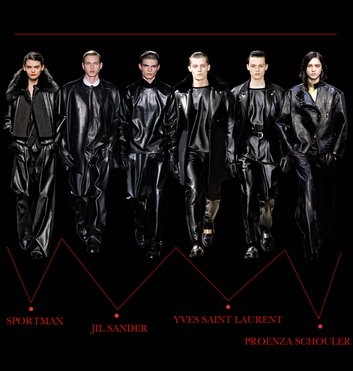 А вот для мужских коллекций Jil Sander и Yves Saint Laurent понадобилась черная кожа в чистом виде: на ее основе дизайнеры составили серьезные, строгие кожаные total-луки, в которых сочетаются брюки, джемперы, пальто и даже галстуки из этого материала. Как ни странно, но именно такие мужественные образы были в дальнейшем задействованы и в женских коллекциях: моделей с ног до головы одели в кожу на показах Sportmax и Proenza Schouler.