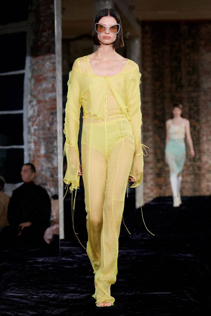 Повышенное внимание к телу в новых коллекциях иллюстрируют обнажающие вещи-обманки. Корсет Sportmax не ощущается на теле, потому что сшит из невесомой органзы. Майки Givenchy, костюмы No. 21 и платья JW Anderson совершенно прозрачны — с ними больше соотносится глагол «раздеться», чем «одеться». Плащ Burberry превращается в сексуальный фартук, оголяющий все, что ниже поясницы.