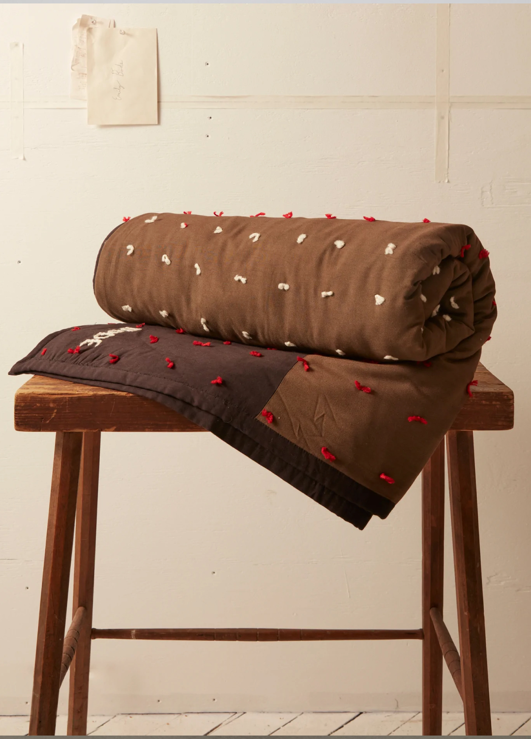 Дизайнер Эмили Боде работает со старым, даже антикварным текстилем. Она собирает редкие ткани по кусочкам и в лоскутной технике шьет из них костюмы и куртки. Особая любовь Эмили — индейские стеганые одеяла. Этот вариант не винтажный, а новый, но в точности повторяет оригинал 1940-х годов. Узелки из ниток контрастного цвета на одеяле не прячутся, а завязываются на виду.