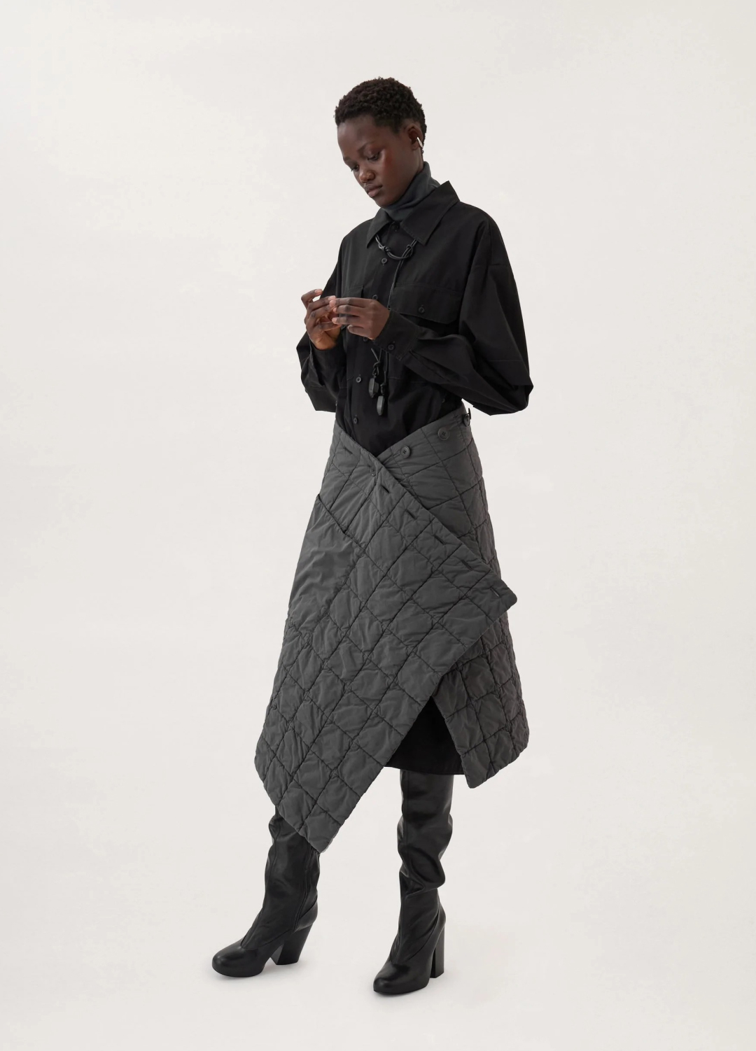 Не уверены, что под эту стеганую нейлоновую накидку влезут двое, но по крайней мере можно носить вещь по очереди. Причем несколькими способами: застегивать на поясе, как юбку (есть кармашек!), или накидывать на плечи, как шаль.