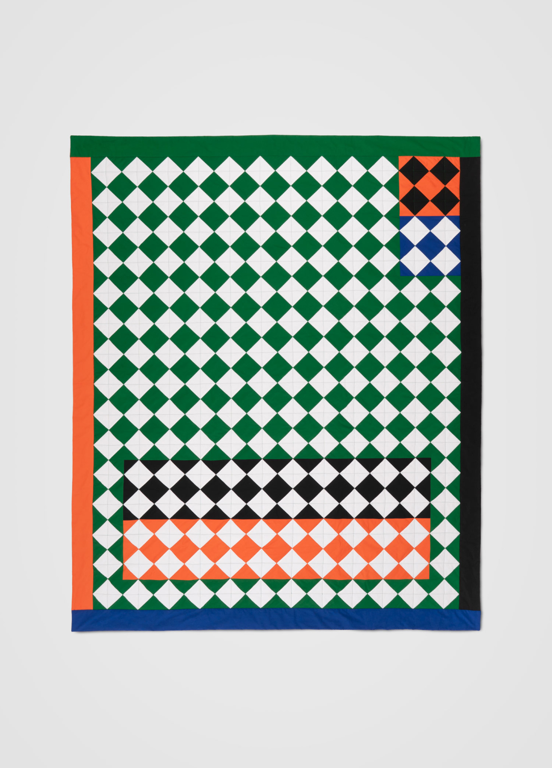Каждое одеяло российского проекта собрано и простегано вручную мамой основательницы бренда. Максимальный тираж — шесть штук, что-то выполнено в единственном экземпляре. К этому покрывалу в ромбик просятся платья и костюмы Nina Donis в похожих расцветках.