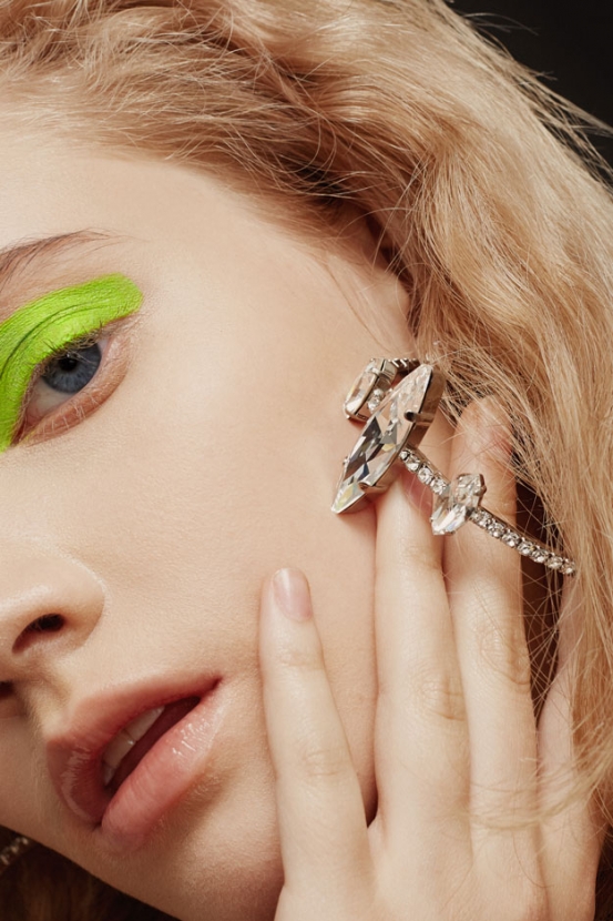 Серьги-кольца уже давно знакомый сюжет, с которым, казалось бы, нельзя сделать ничего нового. Тем не менее форма круга открывает большой простор для фантазии. Так, Miu Miu представил свой экстрагламурный вариант серег-колец, которые лучше всего подойдут для эффектного вечернего выхода или особого случая, когда хочется сверкать в прямом смысле этого слова. Серьги выполнены из серебряной латуни и выложены по периметру мелкими кристаллами с акцентом на крупных камнях вытянутой формы. С таким украшением вам гарантированно захочется собрать волосы в высокую прическу, хотя и за распущенными локонами эти серьги точно не потеряются.