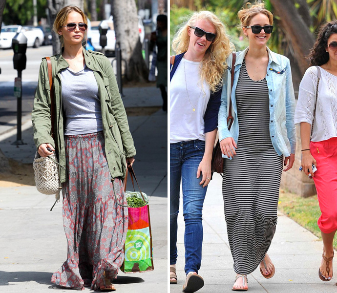 Началось все с мартовских премьер фильма Hunger Games в Лондоне и Лос-Анджелесе, на которых Лоуренс появлялась в золотых платьях Ralph Lauren Collection и Prabal Gurung в пол. Обычно звезды ее возраста предпочитают очень короткие юбки, поэтому на их фоне Дженнифер выглядела принципиально иначе. Теперь длинные юбки перекочевали в ежедневный гардероб актрисы, и нам это очень нравится.