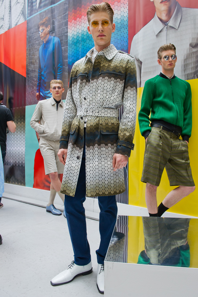 Мужская коллекция Джонатана Сондерса (Jonathan Saunders) — известного мастера принтов — была навеяна образом Дэвида Боуи, но нам, каким бы банальным это ни казалось, больше всего понравился не удлиненный приталенный силуэт, а оптический принт в касающийся друг друга горох разных цветов.