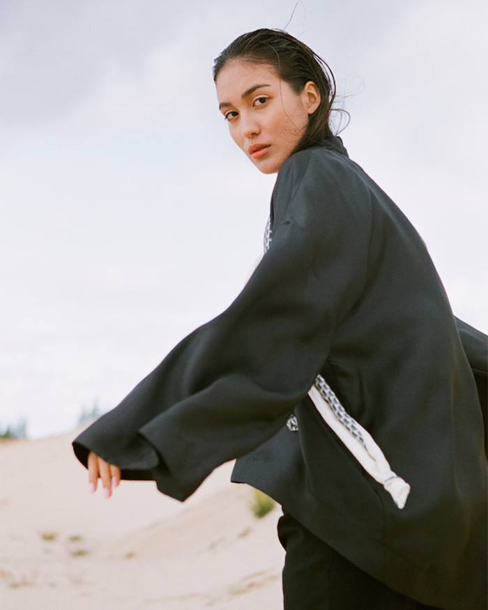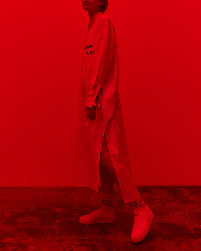 Мне сложно объяснить, что делает Антон Бунденко. Это очень глобально — это раз. Два — это синтез технологий, искусства и моды. И три — уровень его исследований, работы с материалами и их трансформации очень глубокий. Раньше он строил обводные каналы Саяно-Шушенской ГЭС и был горным мастером на объектах строительства Олимпиады в Сочи. Каждая вещь посвящена эмпатии и отражает мысль о том, что будущее — это чувства (с лекцией на эту тему, кстати, Антон выступит у нас). Хочу отдельно отметить уровень его замороченности по материалам и эргономичности вещей: хлопок особенного плетения, шелкография и специальные разрезы на воротниках и манжетах.