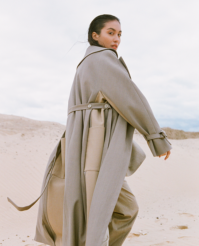 В инстаграме дизайнера Тани Чернышевой из Нижнего Новгорода всего пара фотографий: скульптуры Тони Крэгга и дневниковая запись Ива Кляйна. Мне кажется, это полная характеристика ее марки The Clou. Вещи не кричат о своем происхождении, но выполнены безукоризненно, монументально и сбалансированно. Тренчи, блузы, шелковые платки — в каждом изделии есть принт или деталь, которые отсылает то к прошлому, то к будущему.