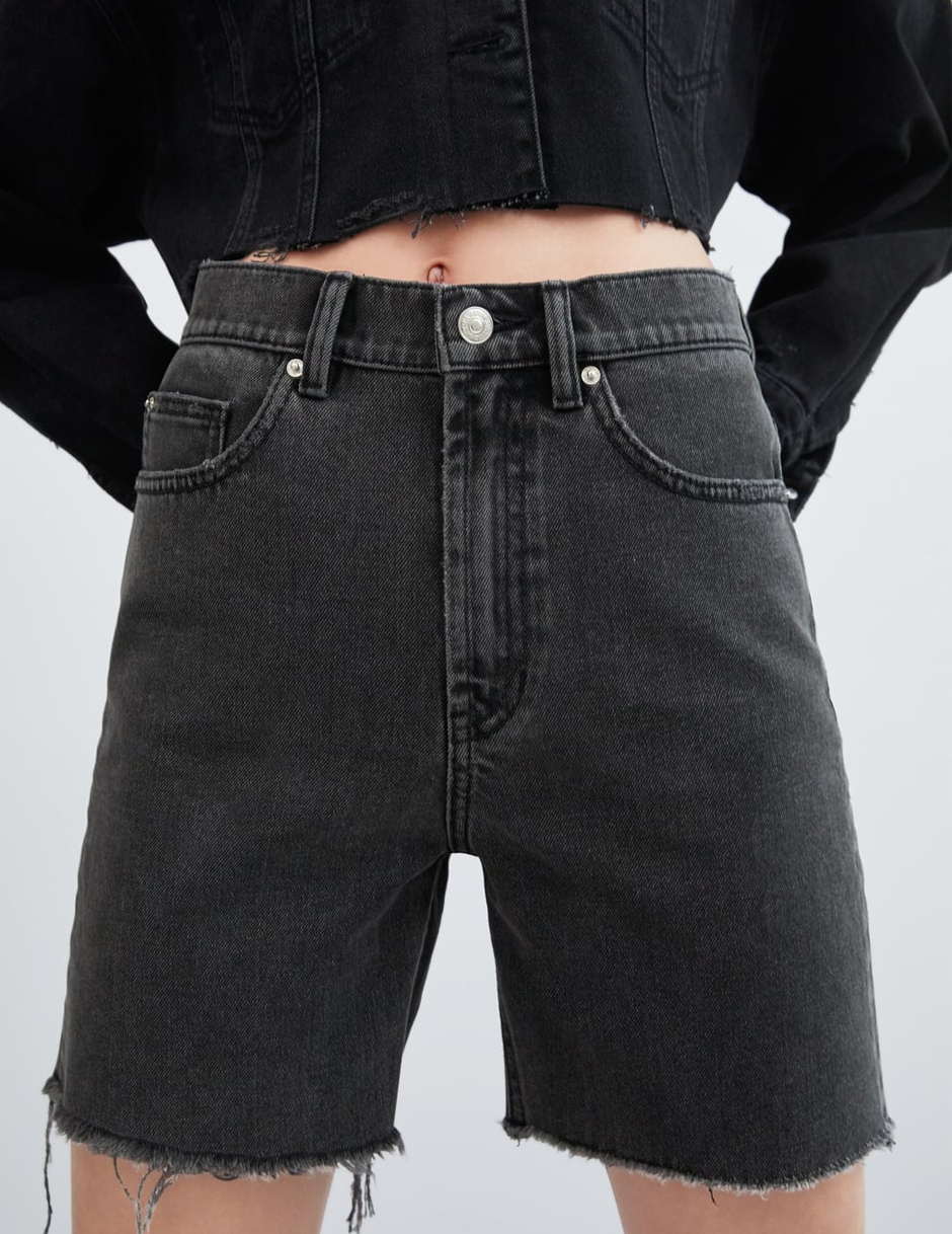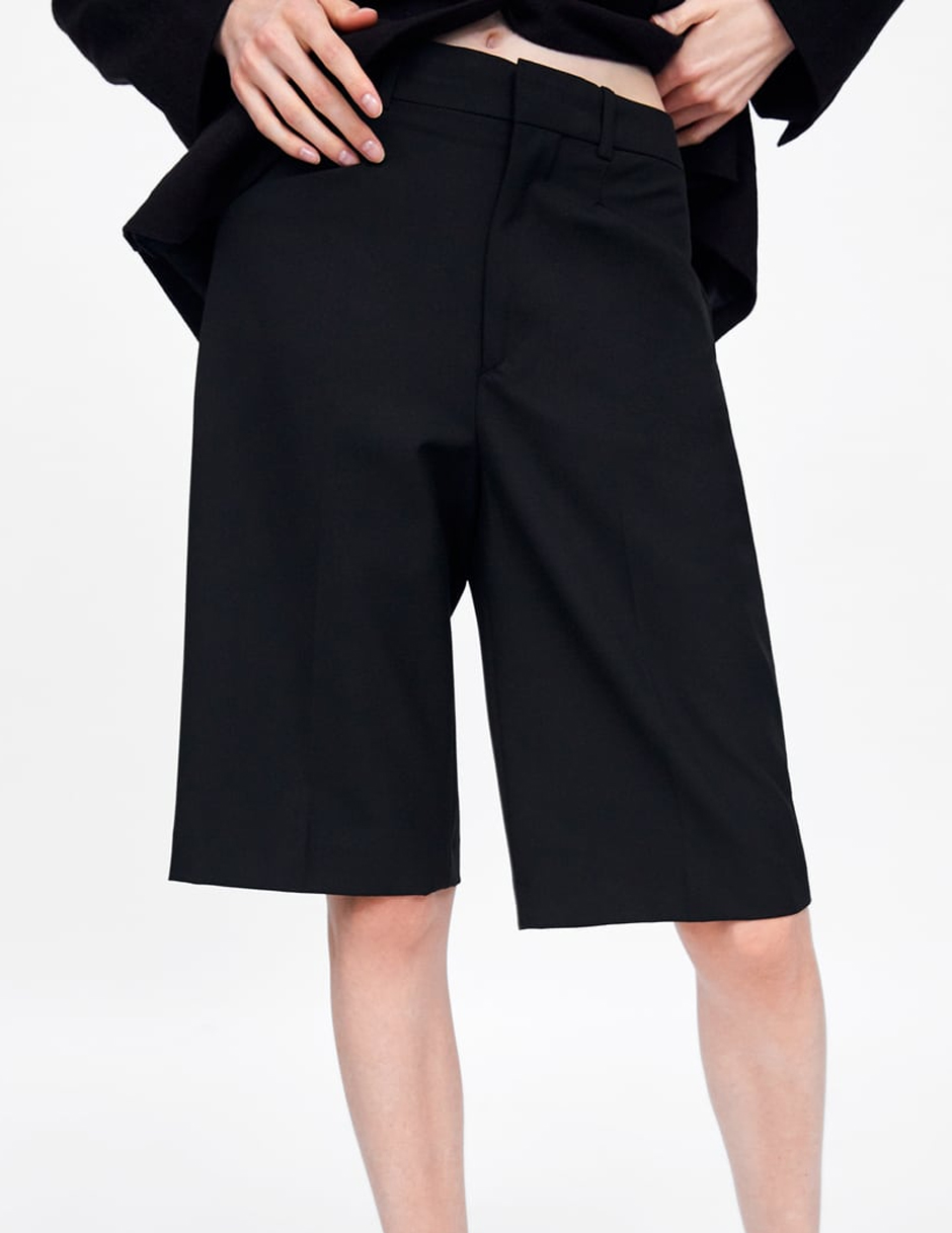 В этом простом, казалось бы, комплекте есть сразу несколько трендовых вещей: кожаный пиджак, шорты по колено, солнечные очки на пол-лица и броская заколка. Образ идеально подойдет для вечерней встречи с подругами или для свидания.