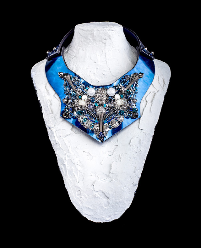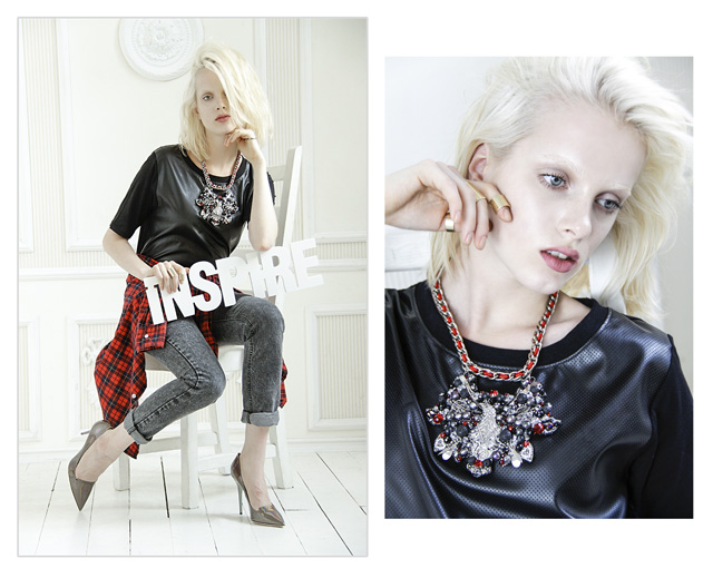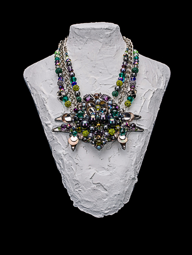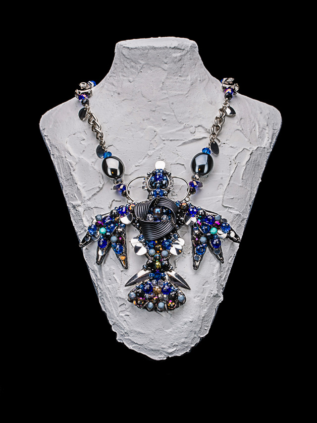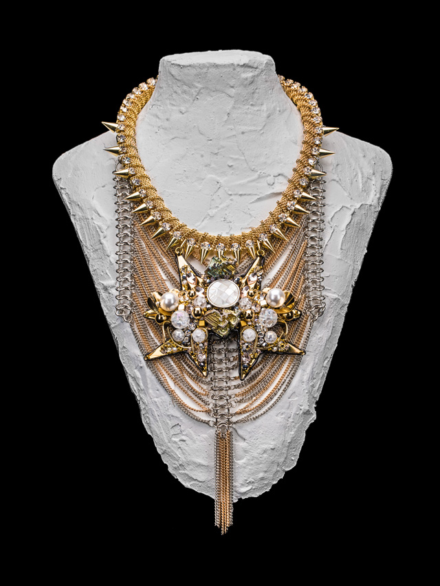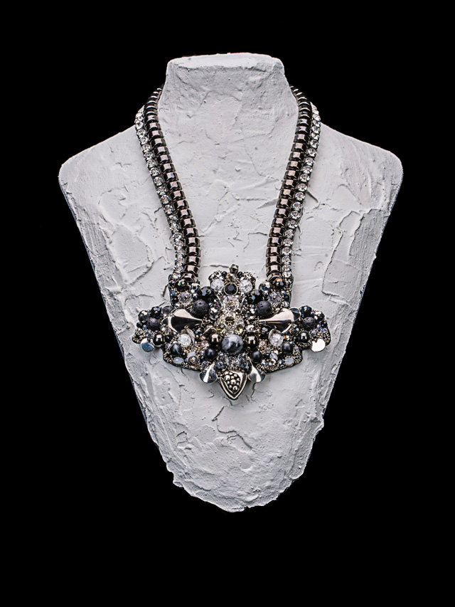 Георгий Рушев, обаятельный человек с совершенно мальчишеской улыбкой — именно дизайнер украшений, и терпеть не может, когда его называют ювелиром. В своих работах он использует не только традиционные материалы, латунь, металл, агаты и другие камни, но и, например, мех — как в украшениях для показа Alena Akhmadullina, вдохновленных тайгой, тотемами и сказкой о двух волчицах. А первую коллекцию колье Георгий и вовсе собрал из настоящих часовых механизмов, которые искал по всем екатеринбургским ломбардам и барахолкам. В каждом его ожерелье зашифрован какой-то тайный образ, у каждого свое имя и особая история. Например, разглядывая под определенным углом колье-мотылька, замечаешь, что в форму бабочки вписана еще и голова единорога. А в другом в затейливой вязи из цепочек обнаружится морда китайского дракона или даже оскал дикой рыси.
