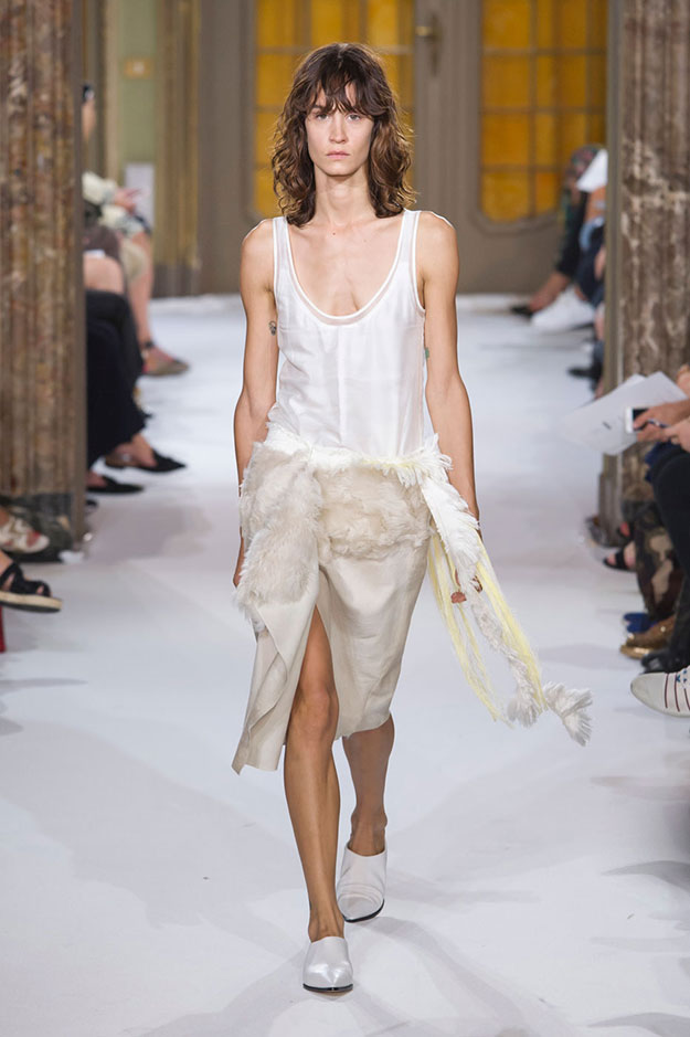 Миучча Прада украсила почти все вещи в коллекции страусиными перьями, включая даже обувь. То, что предсказывает Prada, чаще всего становится стильным трендом сезона. К весне 2017-го стоит инвестировать в перьевые аксессуары или облачение, выбор есть: Gabriele Colangelo, Antonio Marras, №21 показали платья, пиджаки и юбки, украшенные оперением.
