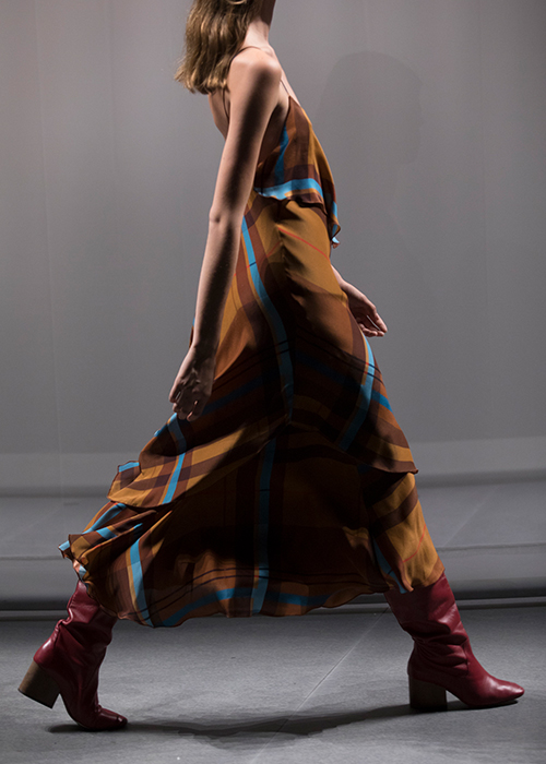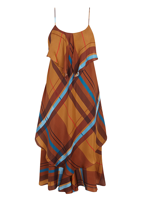 Приход холодов не повод отказываться от этого элемента гардероба. Легкое платье на тонких бретельках в крупную коричнево-бирюзовую клетку будет отлично смотреться с тонкой шерстяной водолазкой и ботильонами на каблуке, а модель с узором в разноцветный горошек и поясом из того же материала — с высокими сапогами гармошкой, как у стильных героинь фильмов 70-х.
