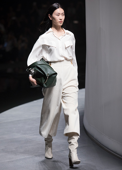 Дизайнеры предлагают сразу несколько вариантов вельветовых брюк: коричневые в стиле ретро, напоминающие морскую форму начала прошлого века (такую модель часто называют sailor pants), минималистичные небесно-голубого оттенка и укороченные цвета слоновой кости с акцентами в виде крупных пуговиц на талии. К последним можно подобрать куртку с карманами из такого же материала и объемную рубашку, составив монохромный лук. Главное — не забыть о контрастных аксессуарах.