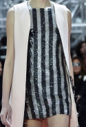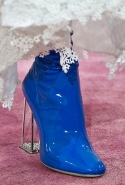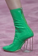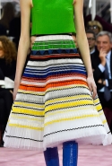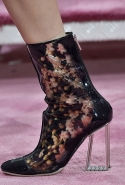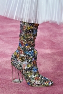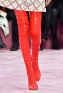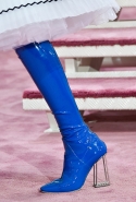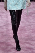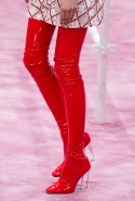 Из всех трех десятилетий, на которые обратил свой взор Раф Симонс, он выбрал самое важное: "романтику 50-х, эксперименты 60-х и свободу 70-х". Неудивительно, что и коллекция получилась очень насыщенной самыми разными мелкими деталями, разглядывать которые можно бесконечно. Первой бросается в глаза обувь — яркие лаковые ботфорты и такие же полусапожки. А при детальном рассмотрении становится ясно, что у них, ко всему прочему, еще и устойчивые, но абсолютно прозрачные каблуки. Это не пластик, как можно подумать с первого взгляда, а просто металлические стойки, опирающиеся на целую сетку крупных стразов. Уже сейчас эти ботфорты кажутся идеальным аксессуаром для любой девушки, которая на Хеллоуин не прочь нарядиться в костюм Женщины-кошки или любой другой супергероини. Но мы будем рады увидеть их и в обычной жизни, за пределами костюмированных вечеринок и площадок для встреч street style-див.