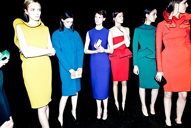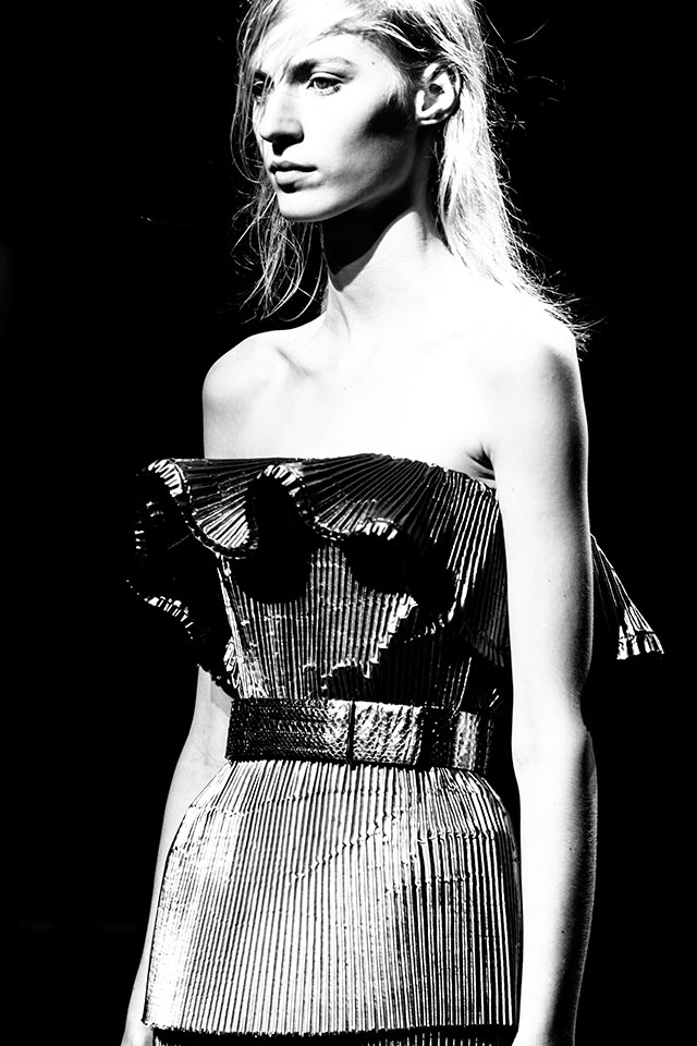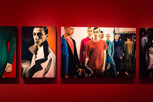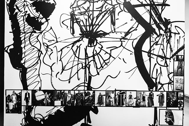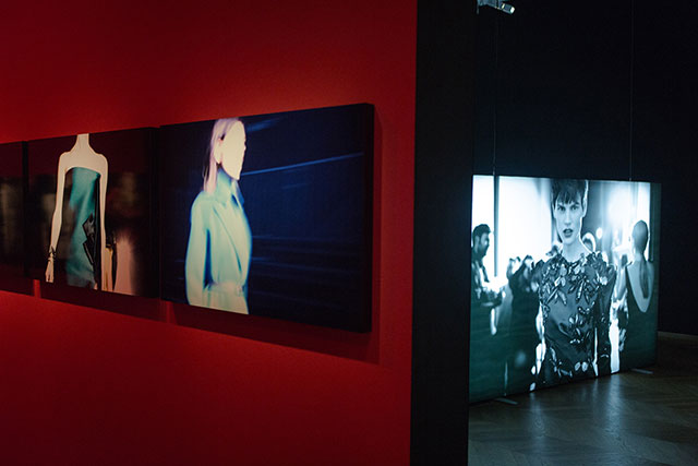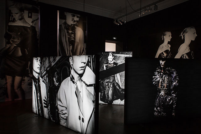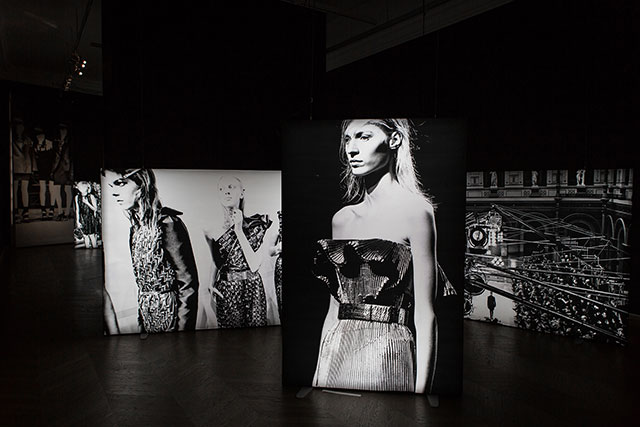 Но вернемся в парижский Европейский дом фотографии. Первый зал во власти черно-белых фотографий — настенных фотополотен, а также инсталляций, которые светятся изнутри. Благодаря последним, мы погружаемся в 3D-пространство, в мир оживших снимков, и своими глазами наблюдаем процесс создания коллекции, примерки костюмов и платьев, съемки модных показов.