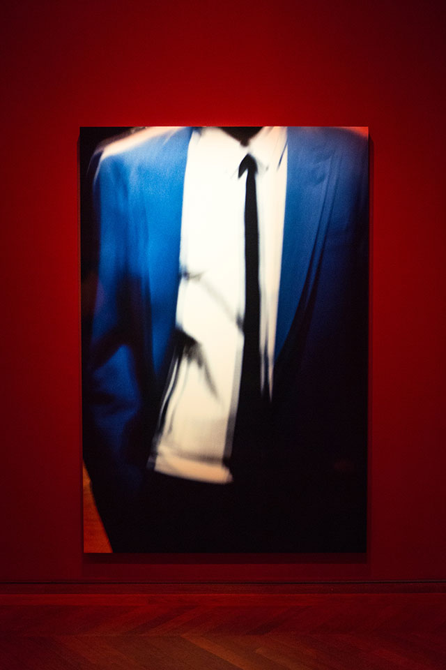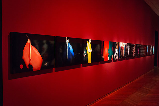 Второй зал в отличие от первого, черно-белого, наполнен яркими красками. Он оформлен в красном цвете и дополняет экспозицию из разноцветных фотографий с показов женских и мужских коллекций. Оттенки фуксии, терракотовый, золотой, горчичный, синий — весь этот театр красочной палитры играет под руководством Альбера Эльбаза. Почти все кадры, представленные на выставке, сняты в движении, и создается впечатление, что выставка живая, что это настоящий танец трехмерных моделей, постоянно меняющийся, как само искусство Эльбаза.