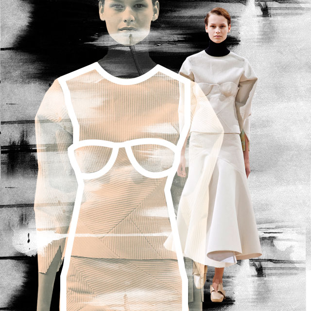 Идеальным вариантом "нижнего слоя" будет тонкая водолазка, как у Kenzo, или полупрозрачный пуловер, как у Philosophy. С другой стороны, Marni используют нарочито толстый свитер, а у MM6 и вовсе белая рубашка. Выглядит слегка небрежно, но в этом и смысл — немного поиронизировать над темой декольте.