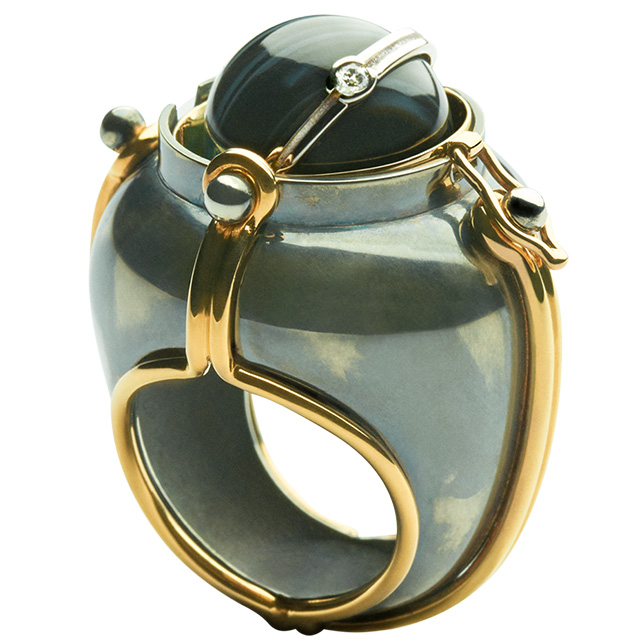 И хотя тематического единства от последующих коллекций марки ждать не стоит, почерк Топа по одной этой серии считывается довольно четко. По словам самого дизайнера, он соединяет между собой две разные, почти противоположные друг другу эстетики: «модернистскую и радикальную» и «более декоративную, барочную». Прибавим к этому страсть Эли Топа к архитектуре и технически сложным механизмам, о чем он сам не раз говорил в своих предыдущих интервью, — и получим самодостаточные и запоминающиеся украшения, выходящие под его именной маркой. Сравнивая создание каждого из них с возведением здания, от укладки фундамента и до внесения последних штрихов в его отделку, дизайнер в процессе использует самые разные техники — от вполне традиционных до новаторских. Значительная часть украшений, например, печатается на 3D-принтере: это позволяет Топу работать с бесконечным числом мельчайших деталей.