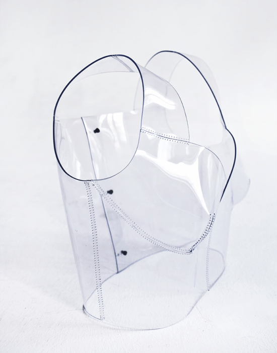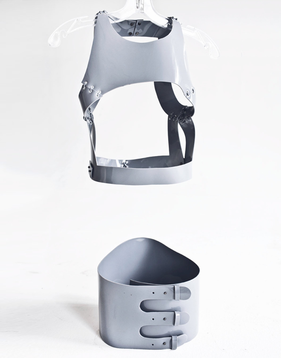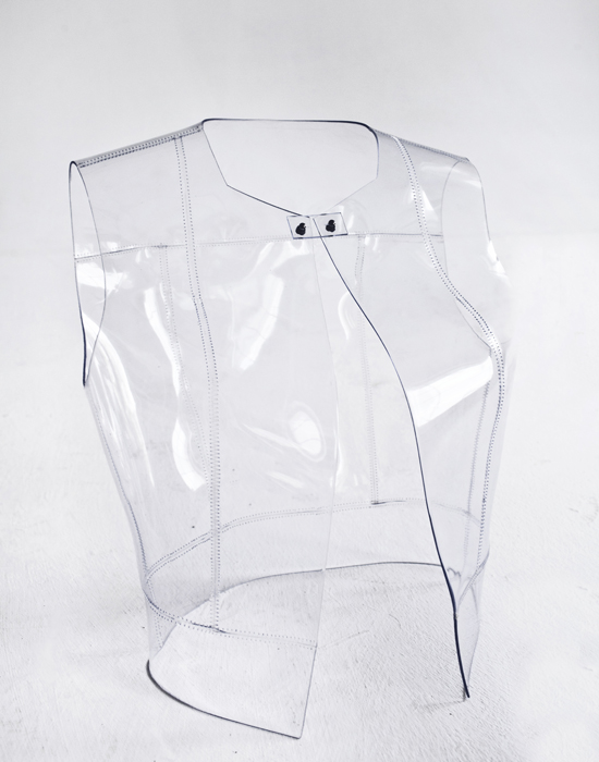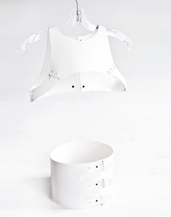 Предметов из кожи в коллекции и правда много: топы с басками, короткие шорты и платья-футляры. Но больше все-таки цепляет другой материал — пластик, напоминающий тончайшие, отполированные до блеска ледяные пластины. Из него Ксения сделала жилеты и широкие ремни, которые надеваются прямо поверх белоснежных платьев или мужских сорочек. "Медитативные пейзажи с холодным дуновением северной природы, застывшие скалы во льду — эти образы вдохновили меня на аксессуары, которые бы имитировали лед или замерзший снег, — объясняет Ксения. — Аксессуары очень универсальны. Они могут легко сочетаться как с вечерним платьем, так и с футболкой или же легким свитером".