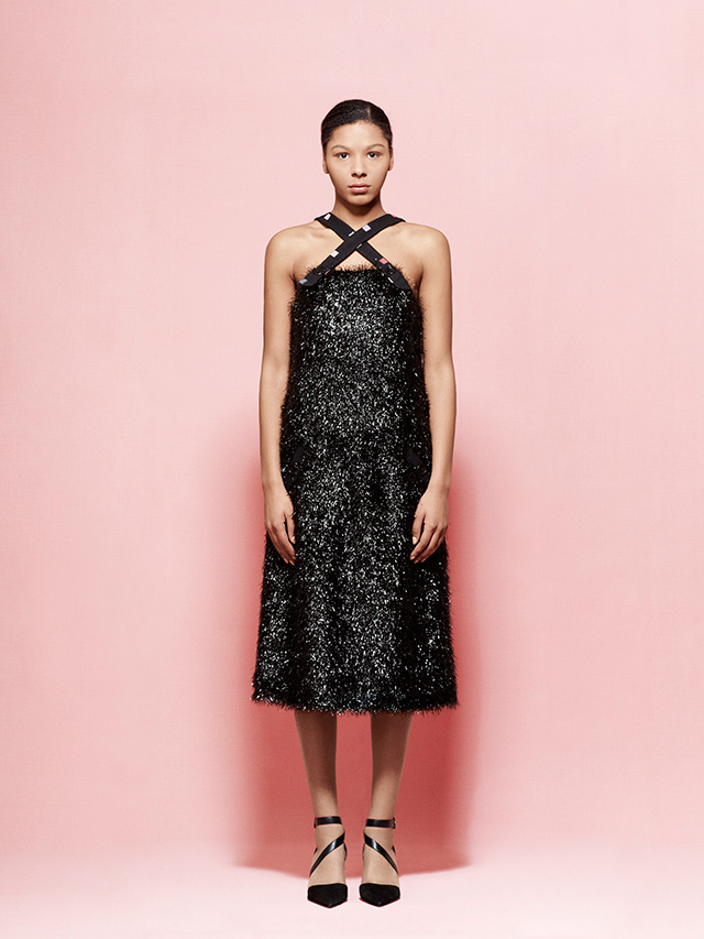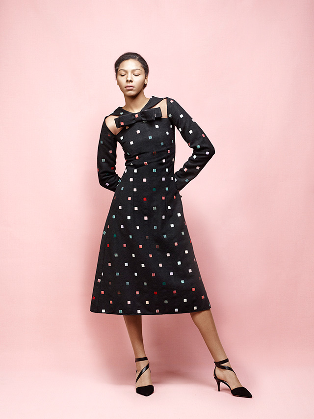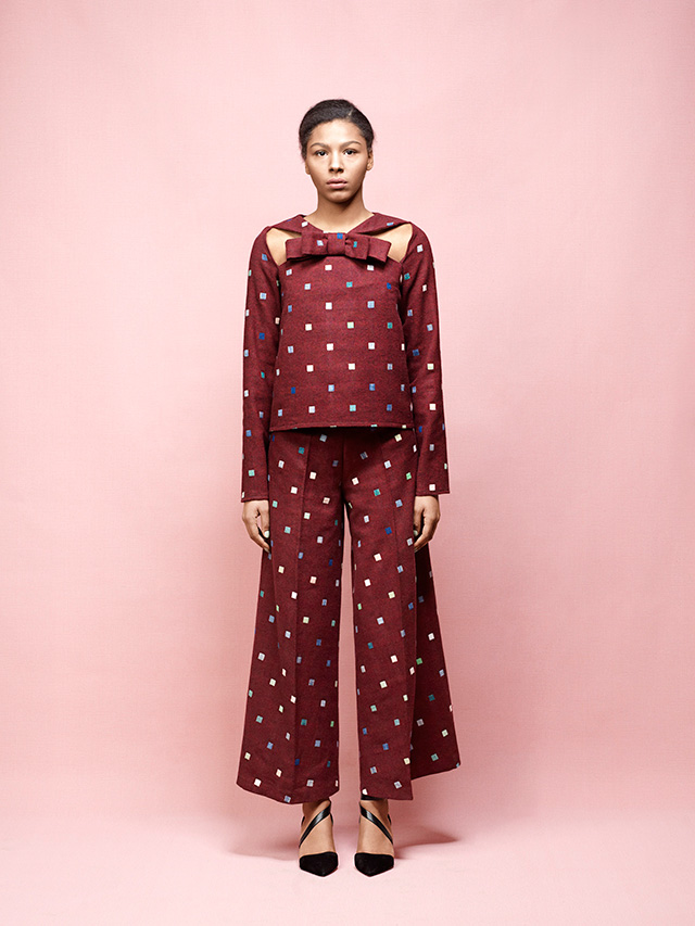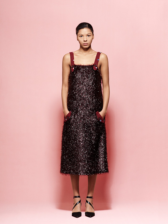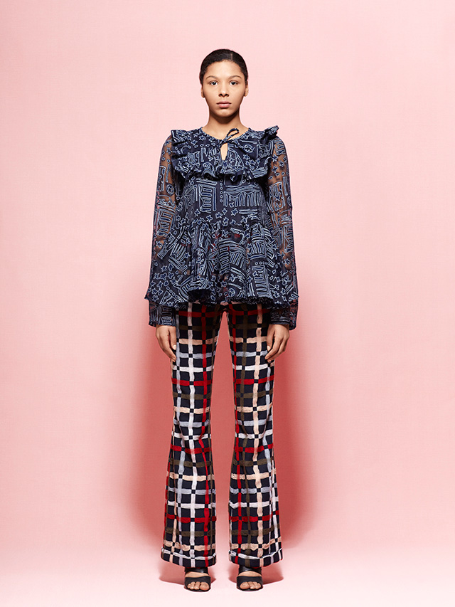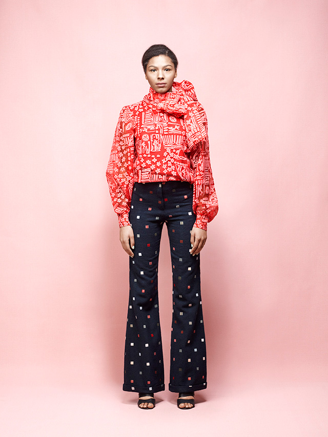 В основу коллекции легла популярная сейчас эстетика 70-х, а заодно и вечная готовность людей этой эпохи веселиться ночи напролет. Глядя на некоторые вещи, непременно хочется тряхнуть стариной, забыть про то, что с утра нужно отправляться на работу, и вместо этого — отправиться танцевать. Брюки клеш, усыпанные цветными квадратиками, красная блуза с пышнейшими рукавами и бантом на шее — остается только отыскать подходящие босоножки на платформе и заучить пару движений из репертуара Джона Траволты в «Лихорадке субботнего вечера». Похожее желание (уже без ассоциаций с Траволтой) вызывают и платья, сшитые как будто из новогоднего дождика, и яркие костюмы из платьев и брюк.