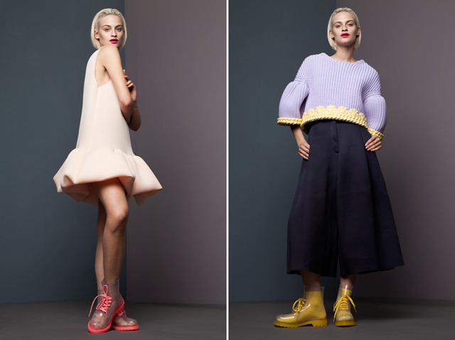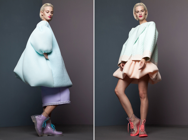 Форму вещам позволяет держать многослойность и использование современных технологий — пропитанные силиконом ткани, вставки из чистого силикона. При этом все вещи, в отличие от неопреновых, удивительно легкие. "Мне хотелось быть уверенной, что моя коллекция будет инновационной, но останется носимой», — объяснила дизайнер.