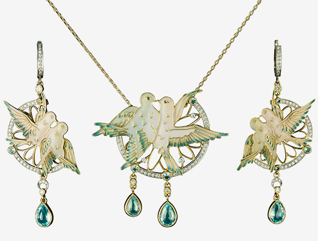 Этот комплект с воркующими голубками из желтого золота с бриллиантами и топазами — совершенно особенная вещь. Кулон и серьги из бутика «Ювелирный 1919» выполнены в технике горячей эмали, в которой невозможно создать предметы, совершенно друг другу индентичные — так что каждое украшение остается неповторимым.