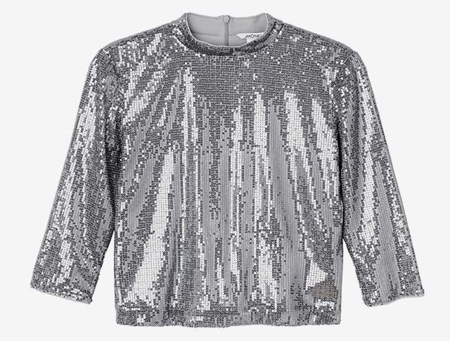 Подарок вовсе не обязан быть дорогим: главное, в конце концов, внимание, а не сумма в чеке. Доказательство тому — этот топ Monki, бюджетная альтернатива сияющей рубашке Dries Van Noten, о которой мы говорили выше. Конечно, материалы вряд ли будут такими же качественными, да и похож он скорее на дискобол, чем на дорогую елочную игрушку, но праздничное настроение создаст ничуть не хуже.