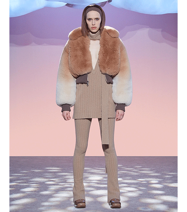...В-N-ных, помимо платьев из полупрозрачных лепестков и вязаных костюмов на подиуме появились и меховые укороченные куртки — похожие одновременно и на плюшевых медвежат, и на сердитые пухлые тучки. И именно эти куртки из стриженой лисы, выкрашенные с эффектом деграде в разные пастельные тона, понравились нам в осенне-зимней коллекции больше всего. На подиуме их было три, но особенно хороша одна, выполненная в оттенках утреннего неба — c плавным переходом от нежно-персикового к лиловому.