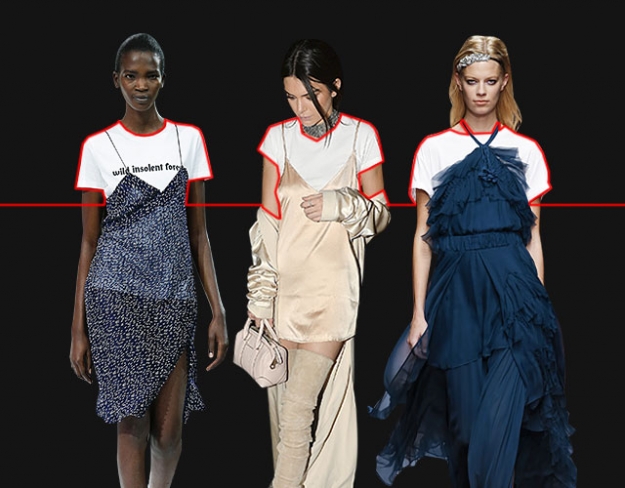 Назад в 90-е: платье на тонких бретелях + белая футболка