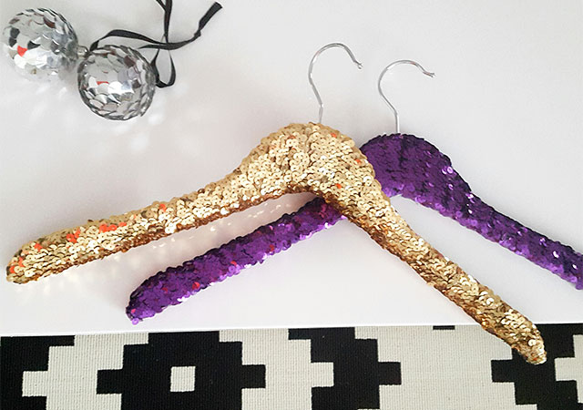 На вечеринке друзей должно быть много, а чтобы было куда повесить их верхнюю одежду (на дворе все-таки зима), стоит присмотреть отдельный небольшой рейл с блестящими вешалками. Легкий намек на то, как пройдет праздник. Найти такое «чудо в пайетках» можно у Sparkling Stories.