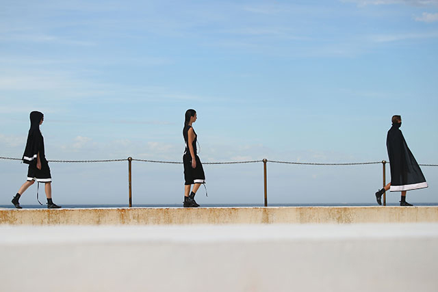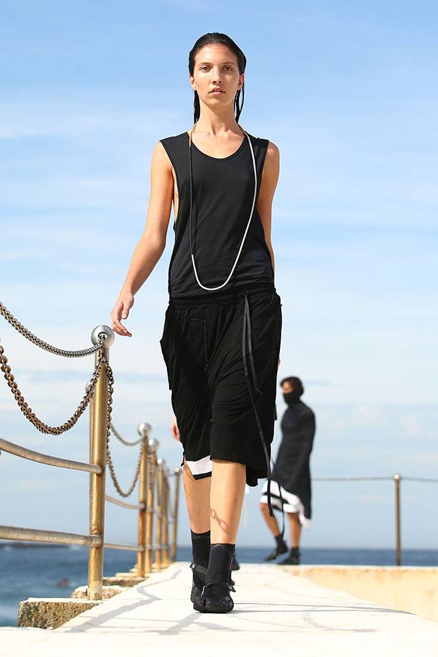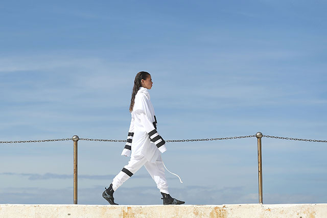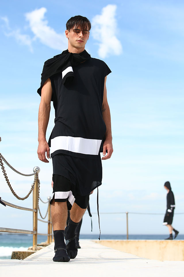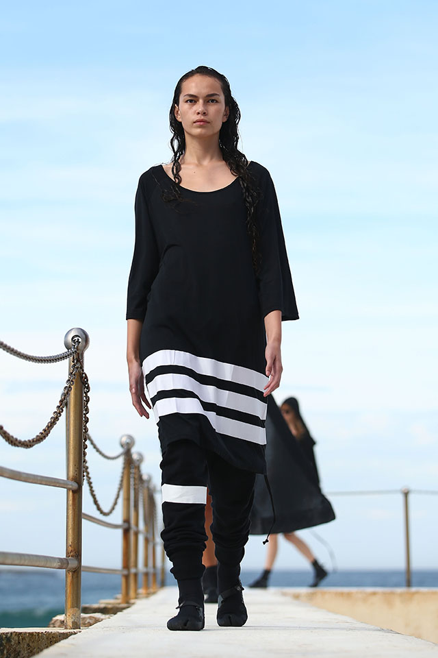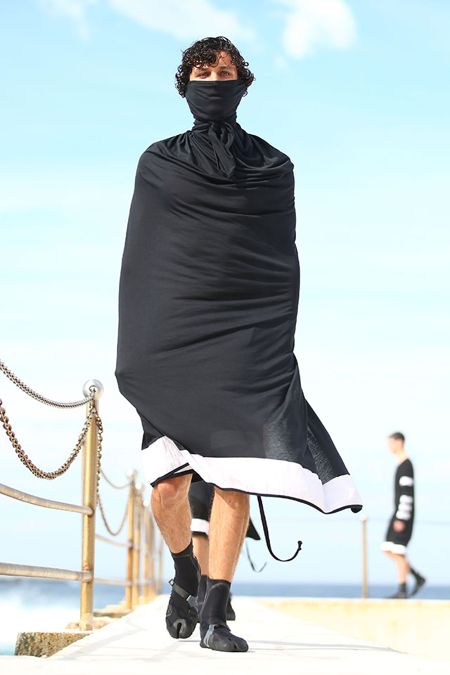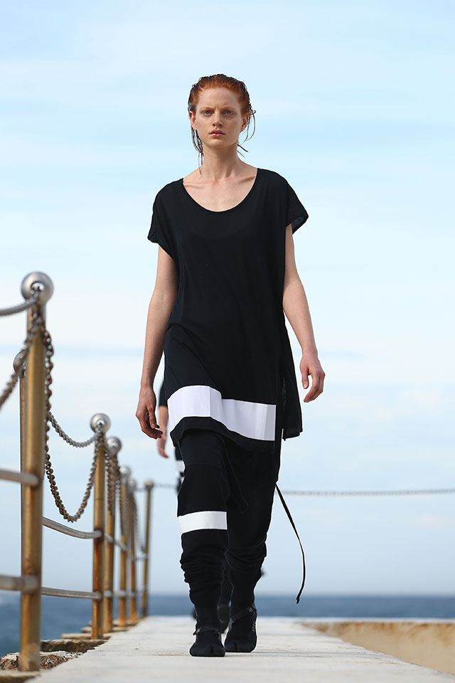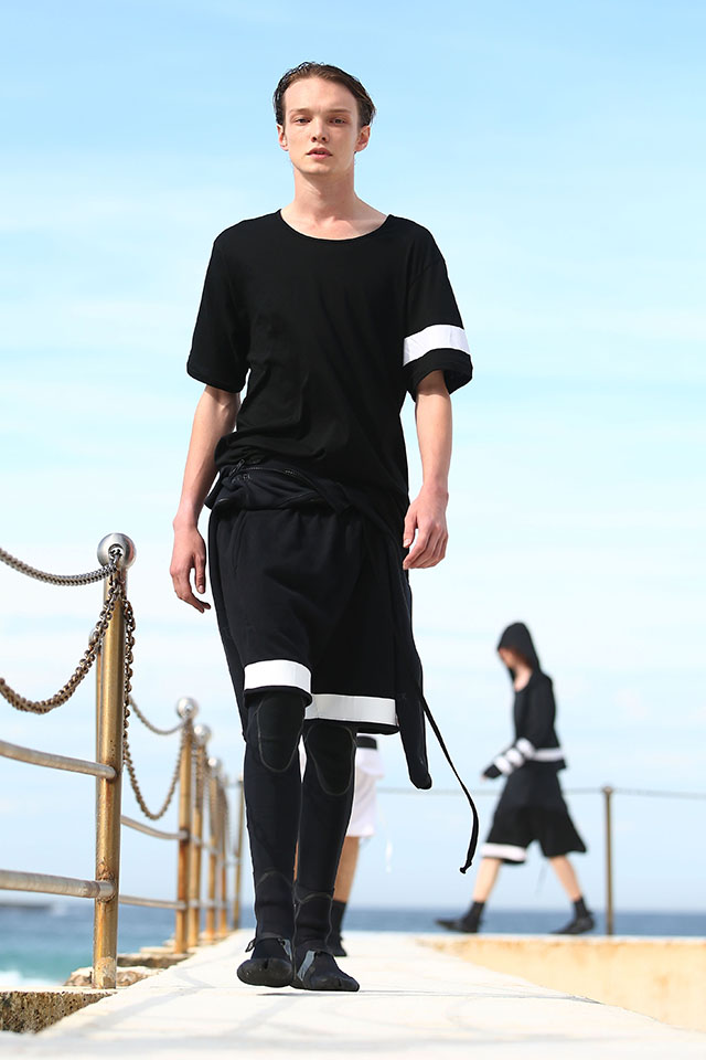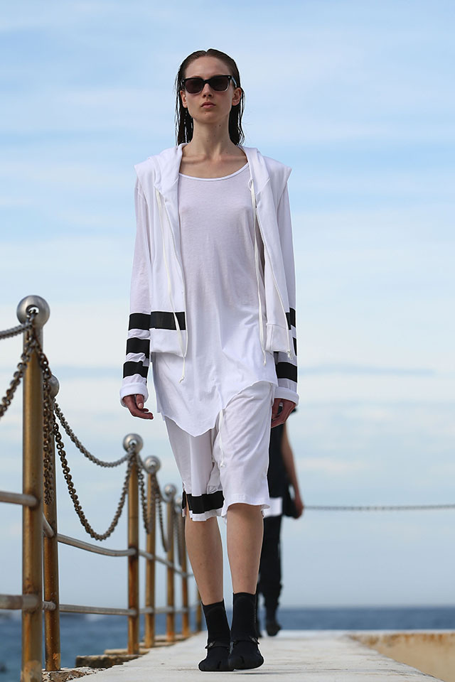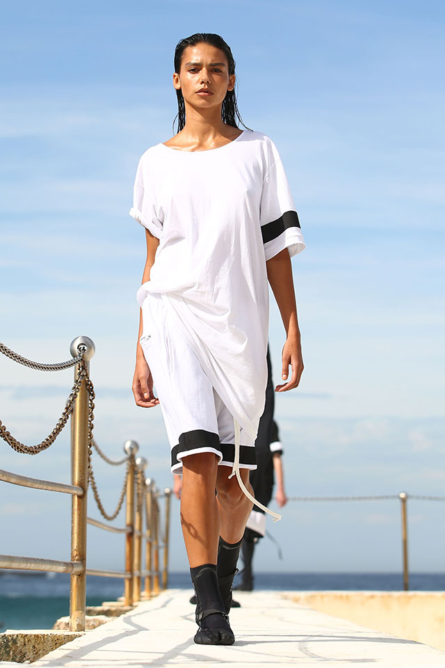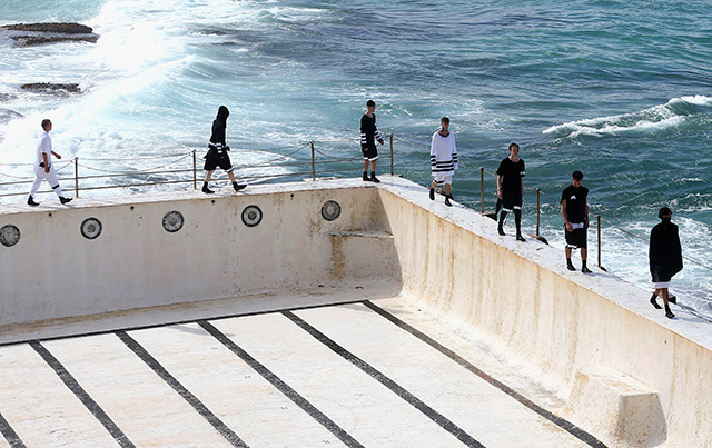 А шоу молодой местной марки Ten Pieces оказалось самым впечатляющим: графичные вещи исключительно в черно-белой гамме, может быть, и не выглядели бы так эффектно, если бы не локация, выбранная организаторами, — модели вышагивали по высоким каменным бортикам огромного бассейна Iceberg, а на заднем фоне шумели волны Тасманова моря.