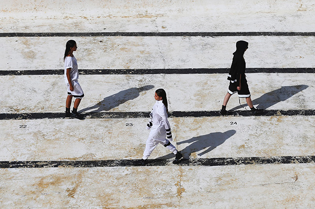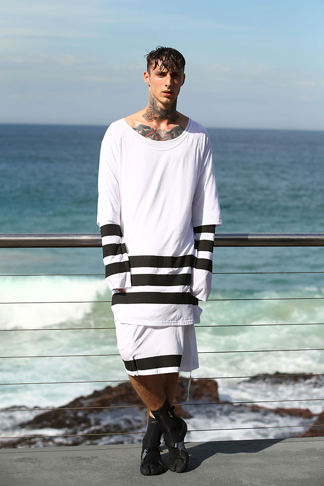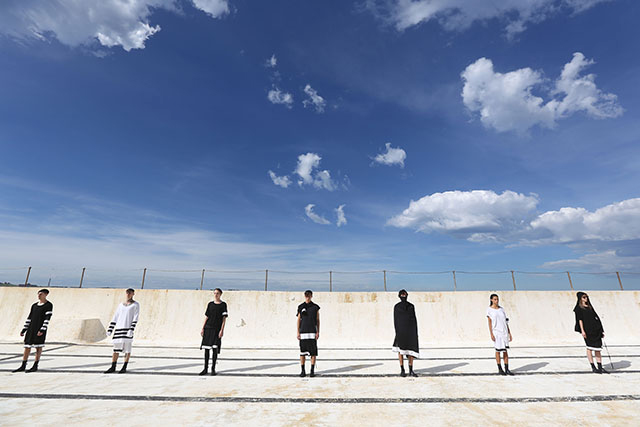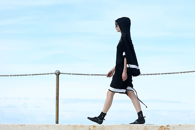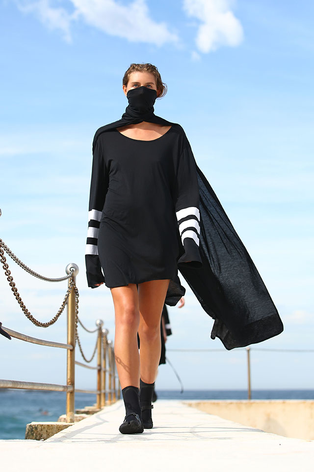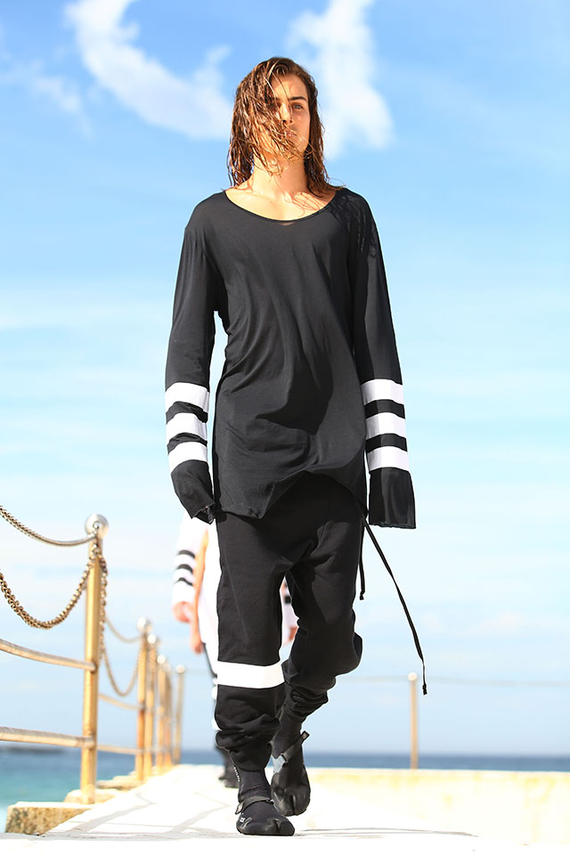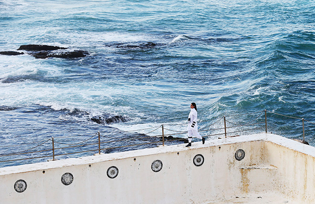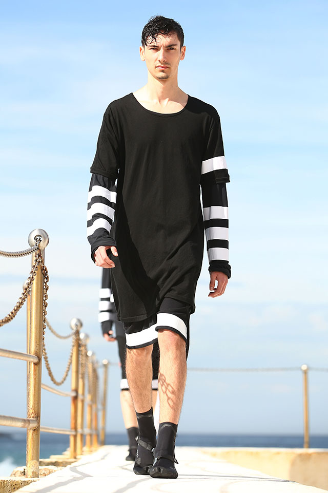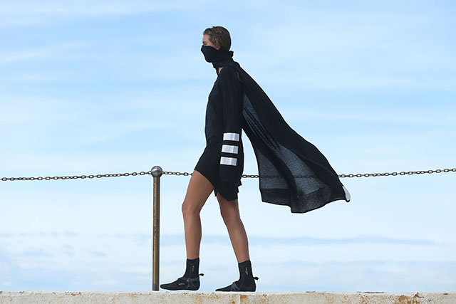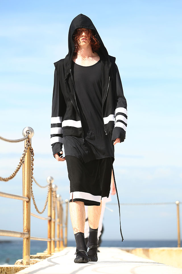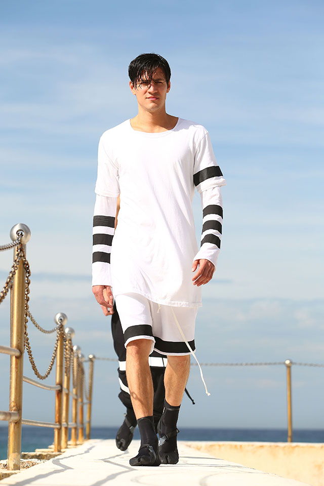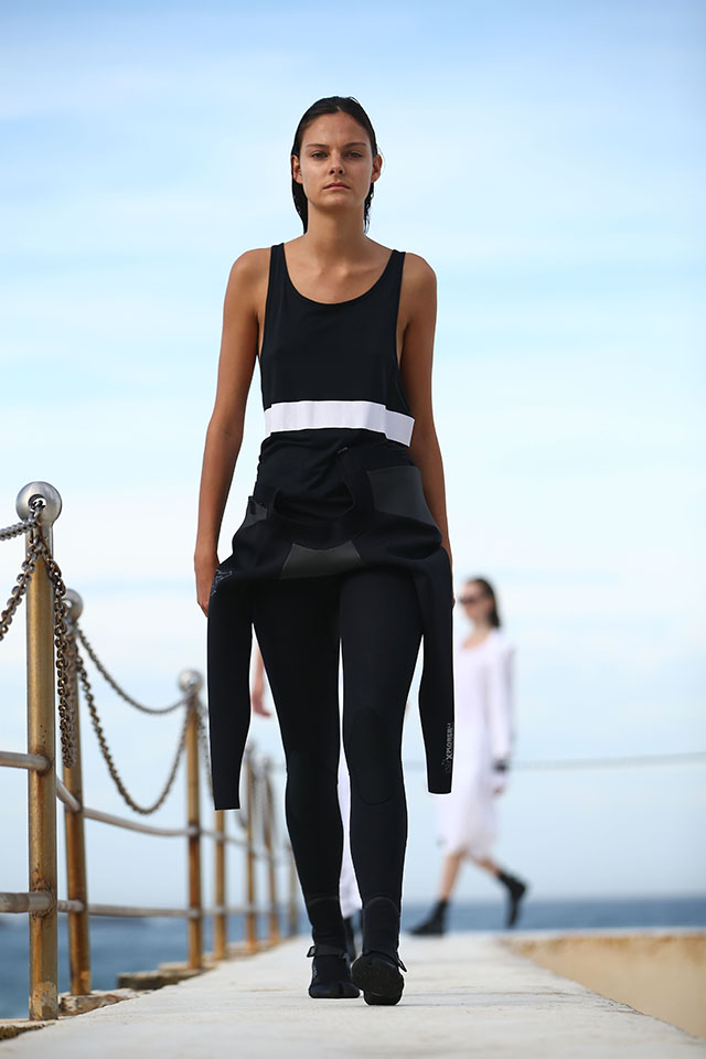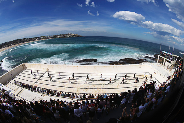 А шоу молодой местной марки Ten Pieces оказалось самым впечатляющим: графичные вещи исключительно в черно-белой гамме, может быть, и не выглядели бы так эффектно, если бы не локация, выбранная организаторами, — модели вышагивали по высоким каменным бортикам огромного бассейна Iceberg, а на заднем фоне шумели волны Тасманова моря.