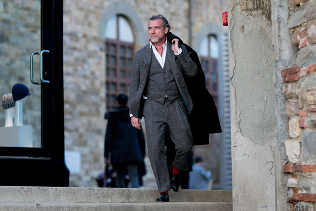 Невероятно, но факт: в этом году непременная роскошная борода перестала быть главным аксессуаром мужчин с Pitti Uomo. Кто-то совсем избавился от растительности на лице, предпочтя ей гладко выбритые щеки, другие просто укоротили свои бороды, а третьи решили отдать все освободившееся время уходу за пышными усами. И пусть читатели простят нам эти ремарки: только подобными рассуждениями и получается эффективно отвлекать себя от растущего курса доллара.