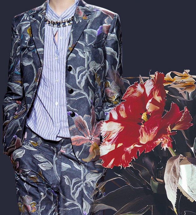 Они никогда не появляются поштучно, только в связке — пышные бутоны, опутанные зеленью листьев. Вязью в виде цветов расшиты платья Valentino и жакеты Antonio Marras, на куртках-бомберах Tom Ford и джемпере Christopher Kane — словно живые цветы-аппликации, цветами же украшены цыганские юбки Givenchy, костюмы Dries van Noten и Giambattista Valli — короче, перечислять можно до бесконечности.