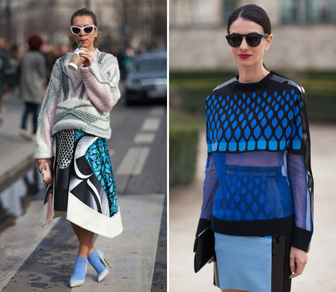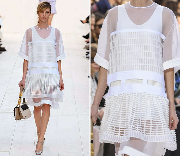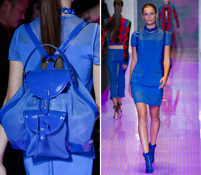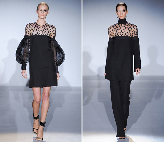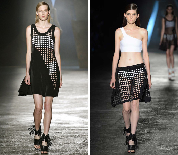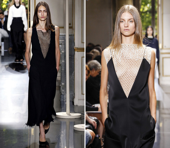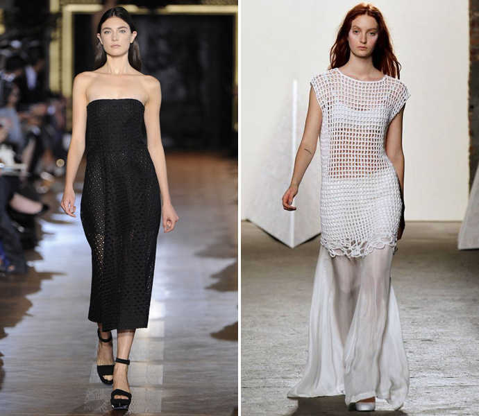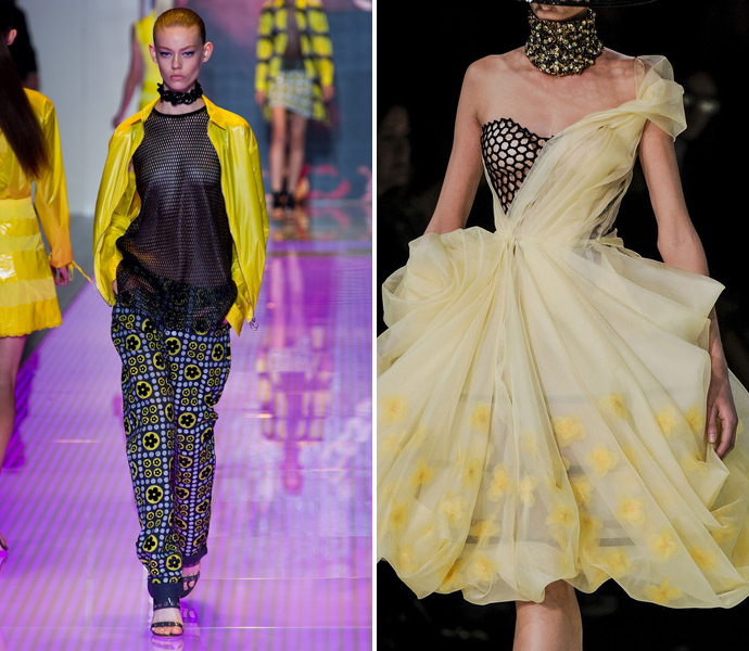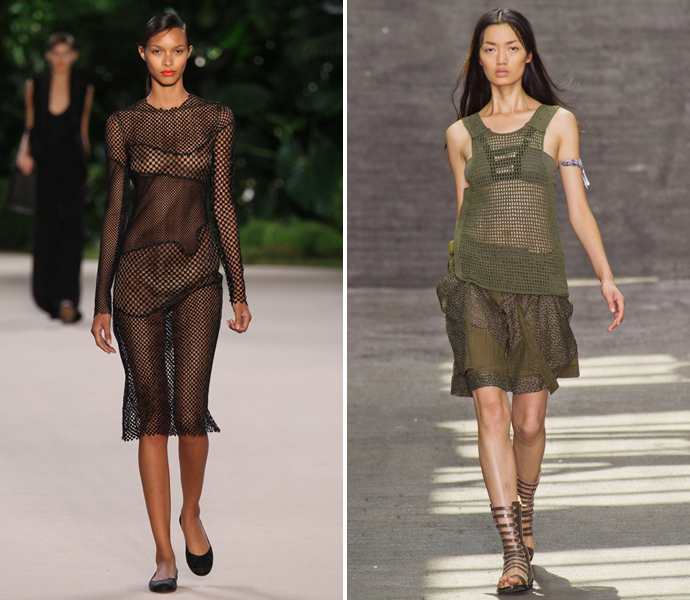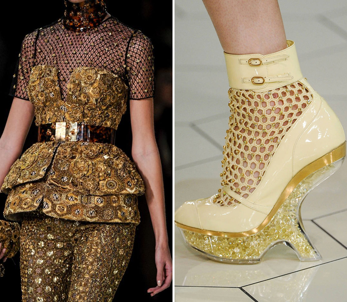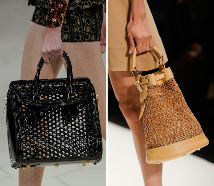 Аксессуары тоже в счет: отличные рюкзаки из сетки были на показе Versus, а туфли с сетчатыми вставками — у Alexander McQueen. Кстати, в коллекции последнего сетки — хоть отбавляй: и в качестве вставок на лифе платья, и на обуви, и даже сетка-обманка на защитных шляпах.