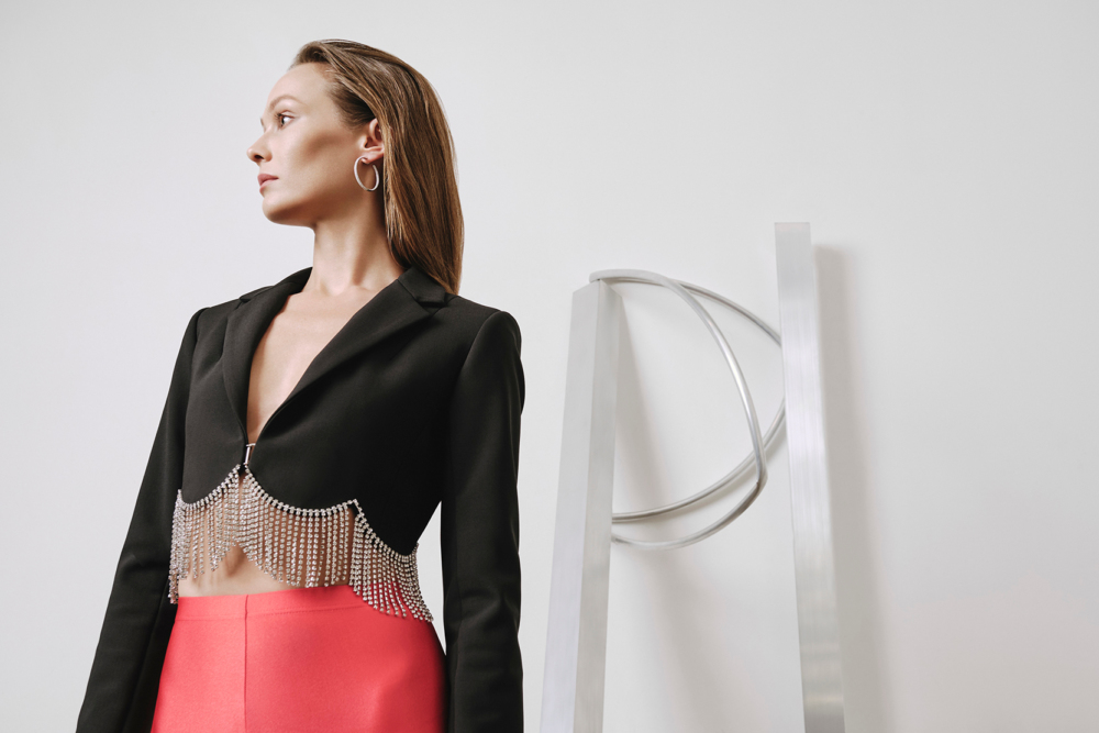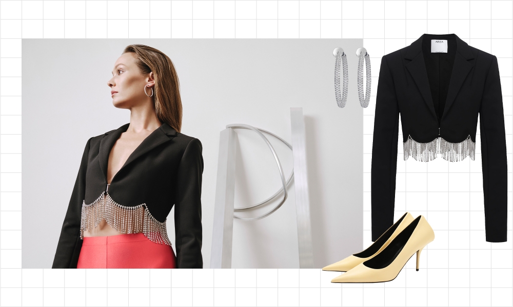 Свой образ я бы условно назвала «все лучшее сразу»: я решила задействовать и колор-блокинг, и бахрому из страз, и глянцевые фактуры. В пару к легинсам я выбрала укороченный жакет Area с «висюльками». Туфли Balenciaga бледно-лимонного цвета поддерживают тот самый колор-блокинг, не перетягивая на себя слишком много внимания. Сумочка Jimmy Choo в пайетках перекликается с декором жакета. Мне хотелось показать, что сочетание нескольких ярких, самобытных вещей в одном комплекте не обязательно сделает из вас городскую сумасшедшую — главное, правильно работать с силуэтом и понимать принципы сочетания оттенков.