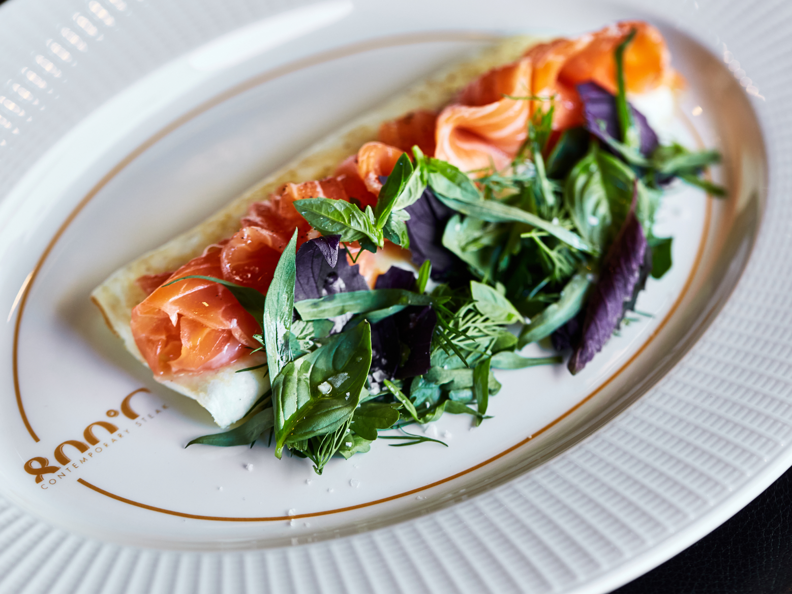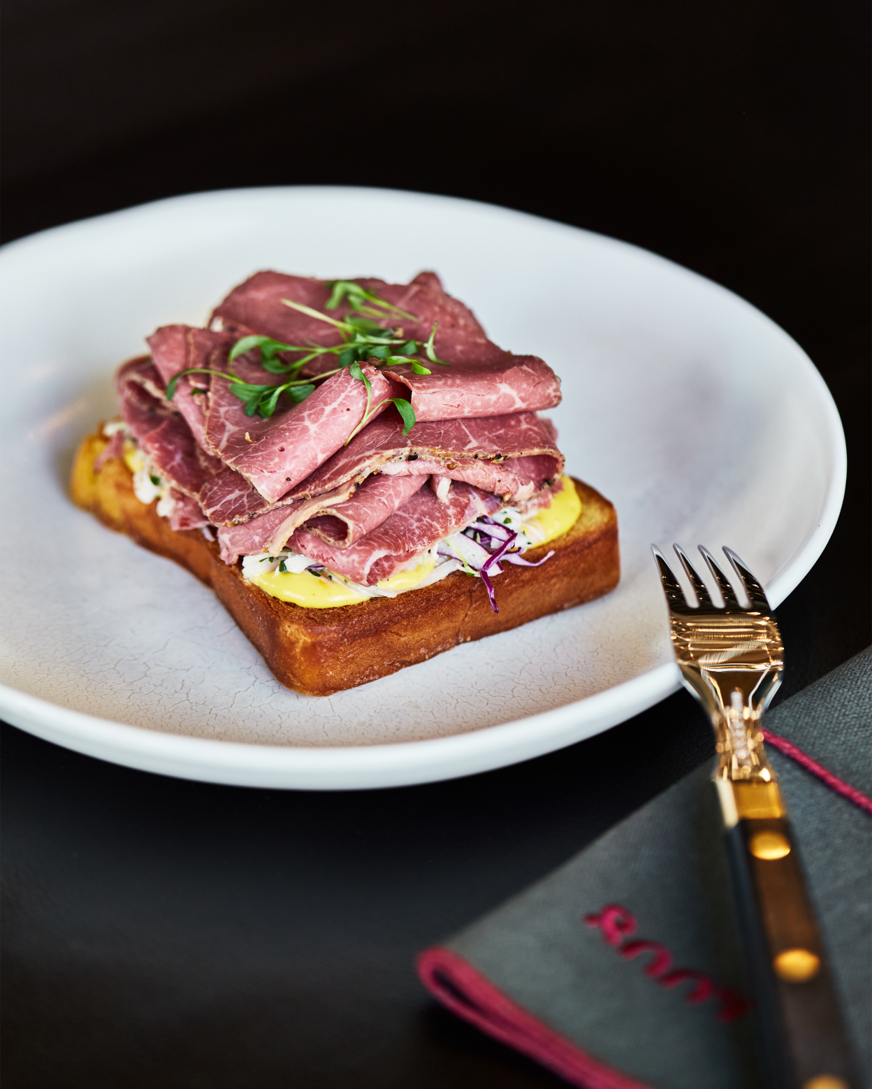 Шеф-повар Сергей Балашов предлагает позавтракать мясом. В меню — яйца в говяжьем беконе с томатами (740 р.), омлет с телячьими щечками и черным трюфелем (860 р.), пряная шакшука с солнечными томатами и опять же щечками (880 р.), блин с говядиной, страчателлой и трюфельной стружкой (1 050 р.), тост с пастрами (750 р.) или с томленой говядиной (850 р.). Главная новинка лета — гурмэ шаурма (от 980 р.) трех видов: классическая, безумно фотогеничная острая с чили, халапеньо и брынзой, а еще в золоте. Можно заказать и съесть в самом ресторане или взять на неспешную прогулку по Патрикам.