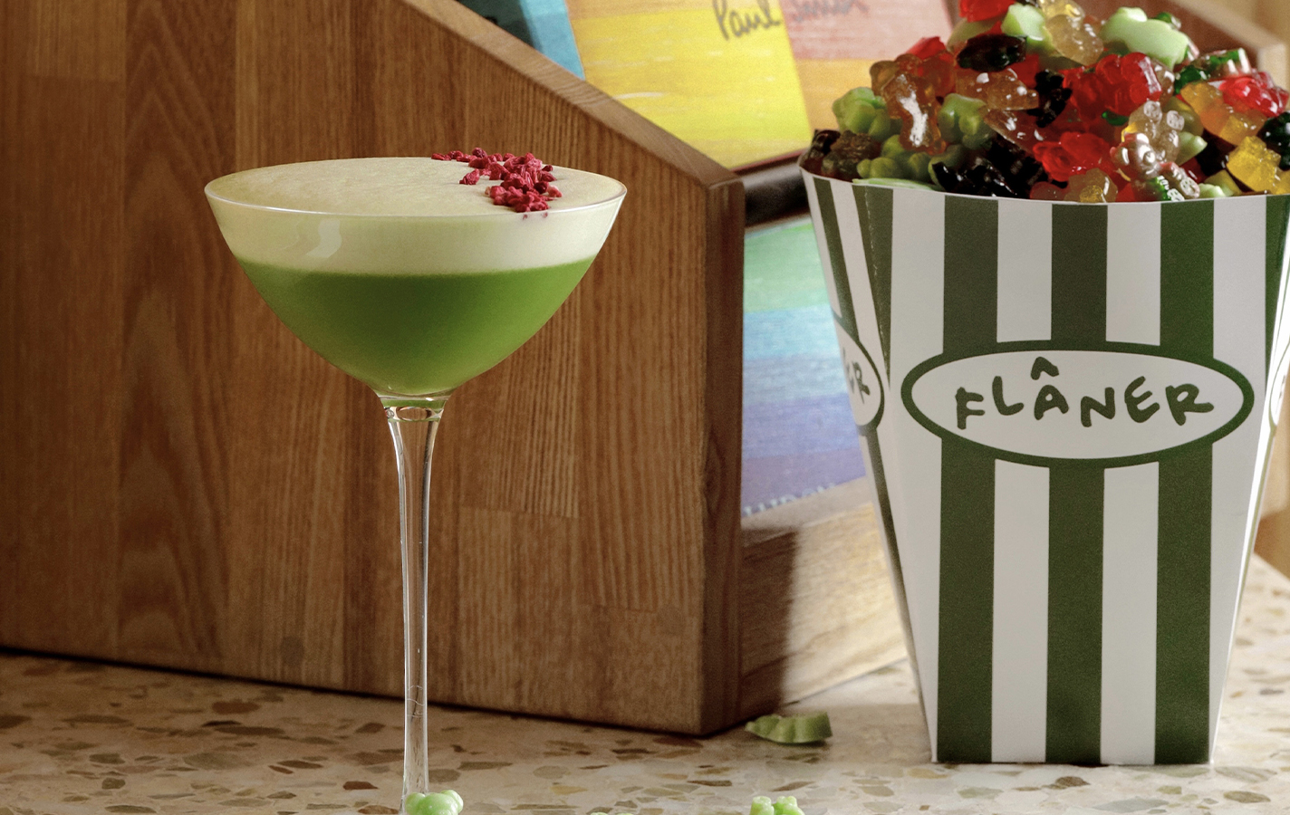На тот случай, если определиться с коктейлем непросто, у главного по бару Ильи Глазунова есть решение. С 20 октября во Flaner можно заказывать алкогольных мармеладных мишек Haribo, чтобы определиться с предпочтениями. Выбранный вами вкус Глазунов будет использовать в качестве центральной ноты напитка. Главное — не перепутать и не захватить таких мишек с собой в офис в качестве перекуса.