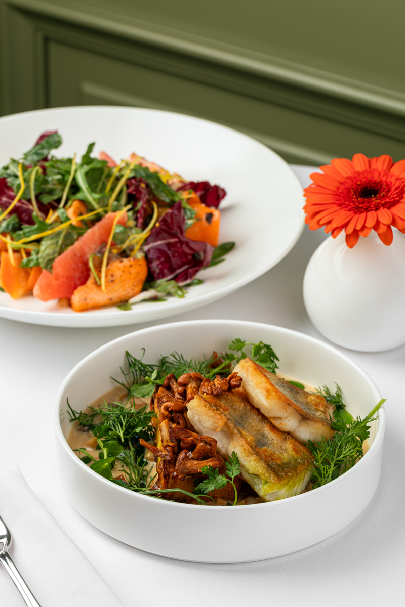 В подборке новых блюд — средиземноморские акценты, летние сочетания и авторские интерпретации европейской кухни. В разделе салатов появились «Цитрусовый лосось» с радичио, руколой и красной рыбой, а также «Супер грин» с миксом салатов, мятой, огурцами и грушей. На горячее советуют говяжью вырезку с картофелем пай и соусом понзу, цыпленка в бургундском соусе с гречкой и белыми грибами и картофельные зразы с мясной начинкой и маринованными овощами.