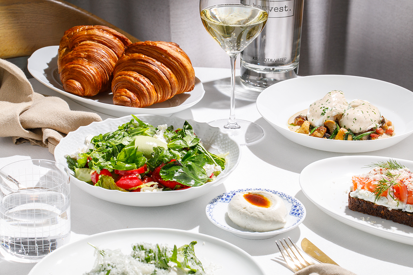 Утреннее меню открывает раздел салатов, в списке — кейл с помело, цветная капуста с йогуртом и базиликом, рукола с грушей и страчателлой, киноа с тыквой и фетой. Также пробуем боулы из йогурта с киноа и вяленой клюквой или с овсяными хлопьями, бананами и карамелью. Среди блюд из яиц — пашот со спаржей, омлет с фетой и травами и скрэмбл с фуа-гра на жаренной бриоши. А на сладкое — тыквенный флан, классические сырники и сдобный маковый пирог со сметанным кремом.
